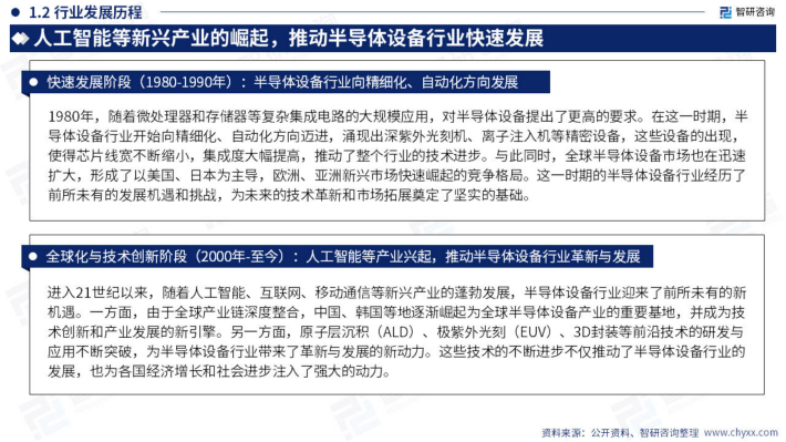 半导体设备行业作为现代科技的核心支柱之一,其发展对于全球信息技术和电子工业格局产生了深远影响。从晶体管的诞生到现今的纳米级芯片制造技术,半导体设备行业的每一次创新和突破都引领了信息时代的巨大飞跃。半导体设备的发展历程不仅推动了科技进步,更是为各国经济增长和社会发展带来了前所未有的机遇。
