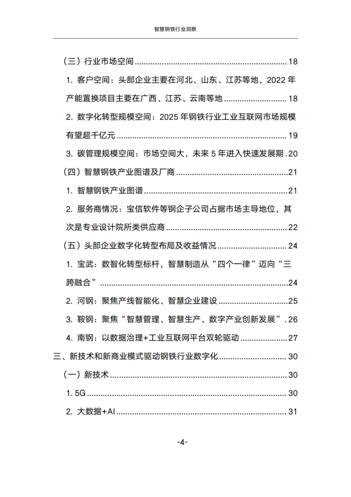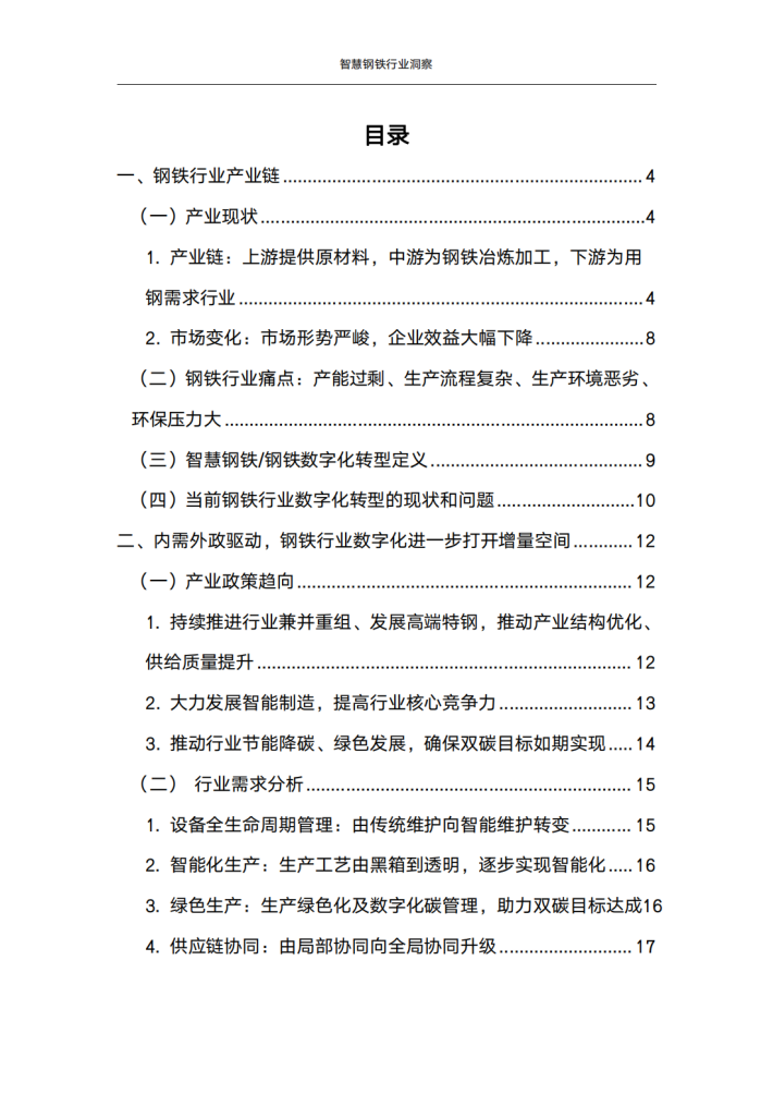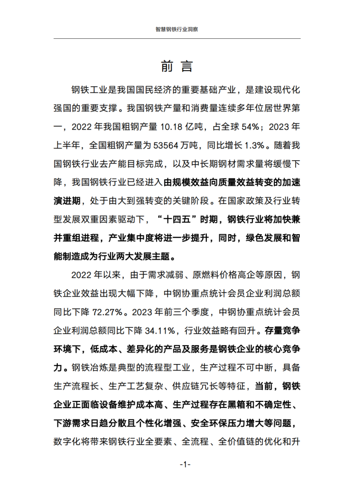 2022年以来,由于需求减弱、原燃料价格高企等原因,钢铁企业效益出现大幅下降,中钢协重点统计会员企业利润总额同比下降72.27%。2023年前三个季度,中钢协重点统计会员企业利润总额同比下降34.11%,行业效益略有回升。存量竞争环境下,低成本、差异化的产品及服务是钢铁企业的核心竞争力。钢铁冶炼是典型的流程型工业,生产过程不可中断,具备生产流程长、生产工艺复杂、供应链冗长等特征,当前,钢铁企业正面临设备维护成本高、生产过程存在黑箱和不确定性、下游需求日趋分散且个性化增强、安全环保压力增大等问题,数字化将带来钢铁行业全要素、全流程、全价值链的优化和升级。