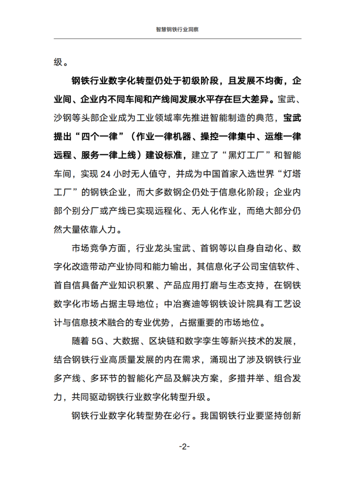 钢铁行业数字化转型仍处于初级阶段,且发展不均衡,企业间、企业内不同车间和产线间发展水平存在巨大差异。宝武、沙钢等头部企业成为工业领域率先推进智能制造的典范,宝武提出“四个一律”(作业一律机器、操控一律集中、运维一律远程、服务一律上线)建设标准,建立了“黑灯工厂”和智能车间,实现24小时无人值守,并成为中国首家入选世界“灯塔工厂”的钢铁企业,而大多数钢企仍处于信息化阶段;企业内部个别分厂或产线已实现远程化、无人化作业,而绝大部分仍然大量依靠人力。