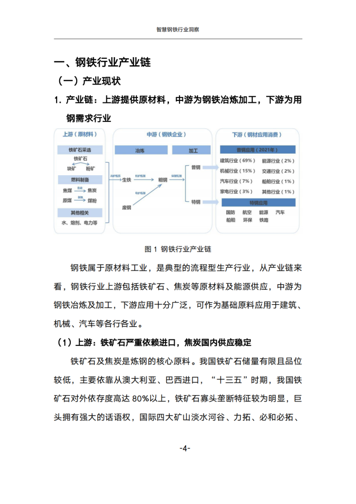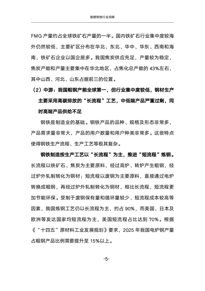 钢铁工业是我国国民经济的重要基础产业,是建设现代化强国的重要支撑。我国钢铁产量和消费量连续多年位居世界第一,2022年我国粗钢产量10.18亿吨,占全球54%;2023年上半年,全国粗钢产量为53564万吨,同比增长1.3%。随着我国钢铁行业去产能目标完成,以及中长期钢材需求量将缓慢下降,我国钢铁行业已经进入由规模效益向质量效益转变的加速演进期,处于由大到强转变的关键阶段。在国家政策及行业转型发展双重因素驱动下,“十四五”时期,钢铁行业将加快兼并重组进程,产业集中度将进一步提升,同时,绿色发展和智能制造成为行业两大发展主题。