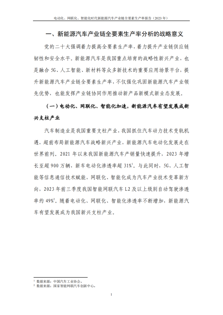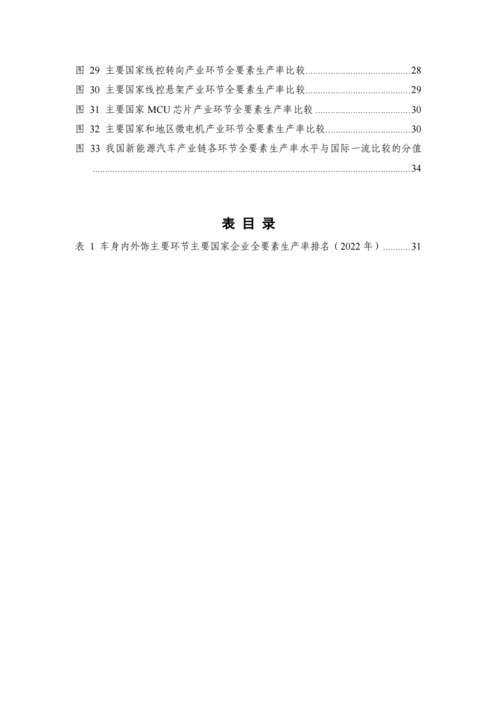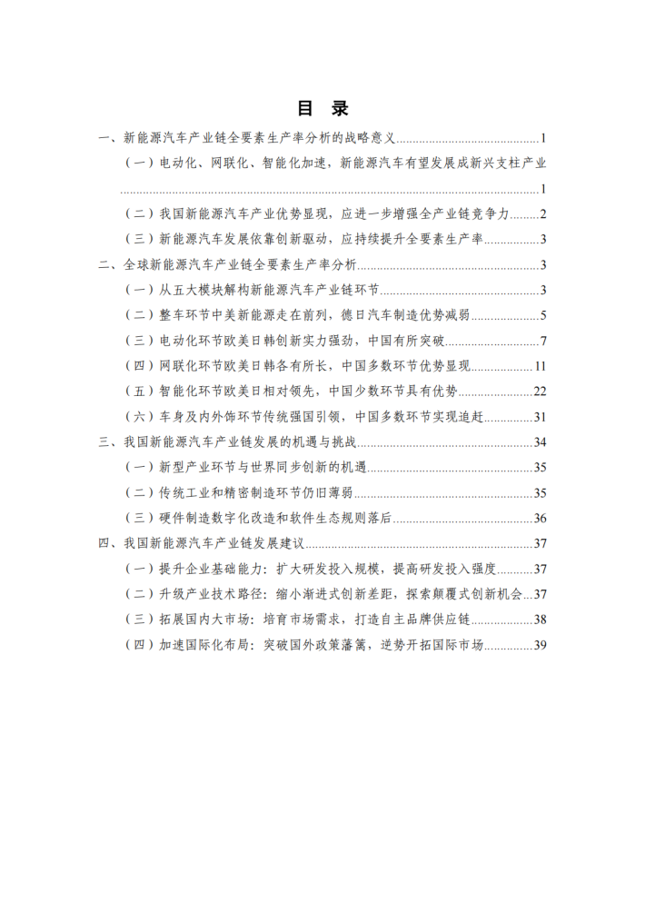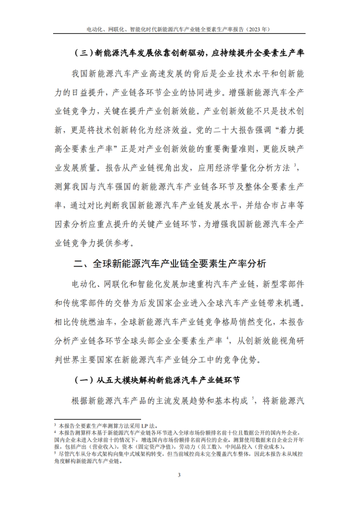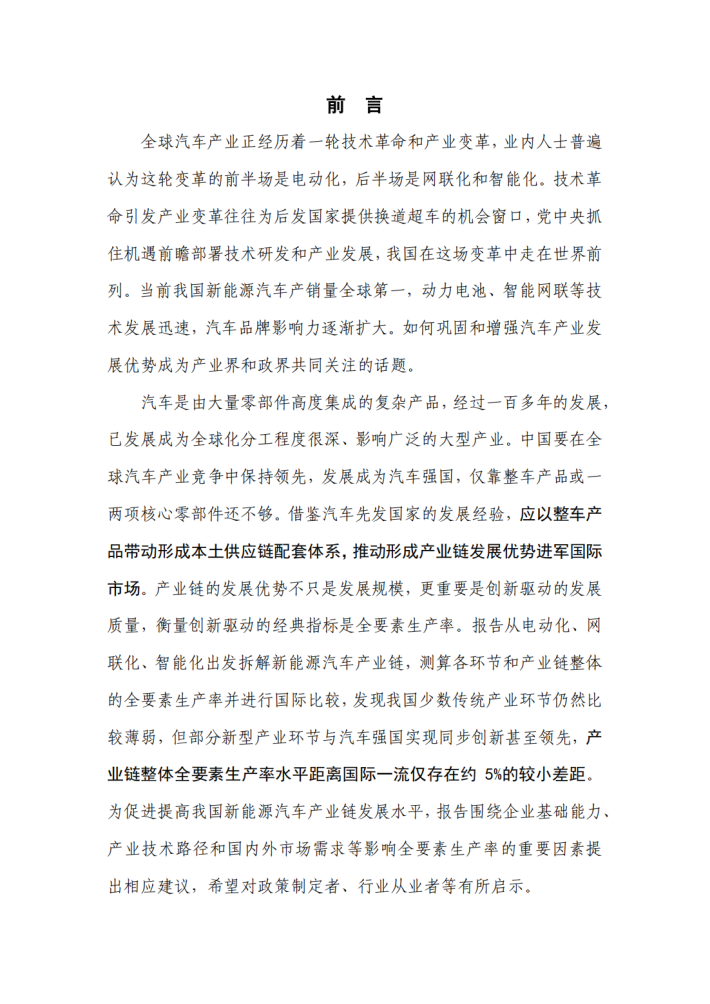 汽车是由大量零部件高度集成的复杂产品,经过一百多年的发展,已发展成为全球化分工程度很深、影响广泛的大型产业。中国要在全球汽车产业竞争中保持领先,发展成为汽车强国,仅靠整车产品或一两项核心零部件还不够。借鉴汽车先发国家的发展经验,应以整车产品带动形成本土供应链配套体系,推动形成产业链发展优势进军国际市场。产业链的发展优势不只是发展规模,更重要是创新驱动的发展质量,衡量创新驱动的经典指标是全要素生产率。报告从电动化、网联化、智能化出发拆解新能源汽车产业链,测算各环节和产业链整体的全要素生产率并进行国际比较,发现我国少数传统产业环节仍然比较薄弱,但部分新型产业环节与汽车强国实现同步创新甚至领先,产业链整体全要素生产率水平距离国际一流仅存在约5%的较小差距。为促进提高我国新能源汽车产业链发展水平,报告围绕企业基础能力、产业技术路径和国内外市场需求等影响全要素生产率的重要因素提出相应建议,希望对政策制定者、行业从业者等有所启示。