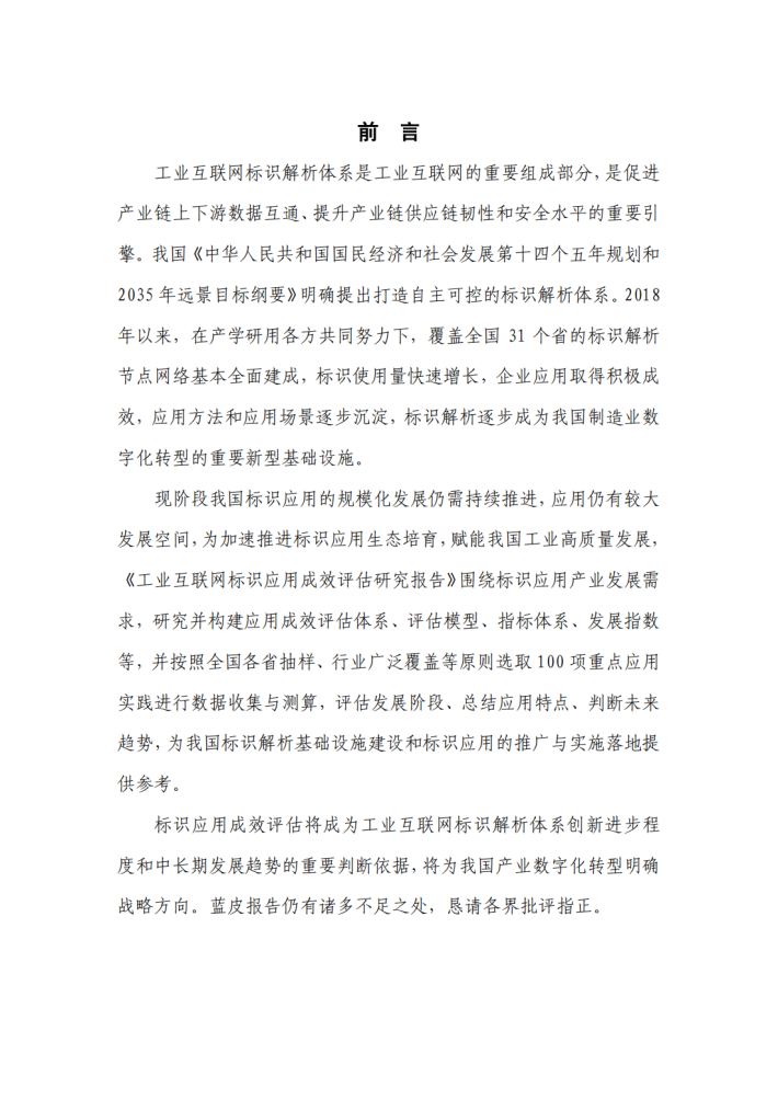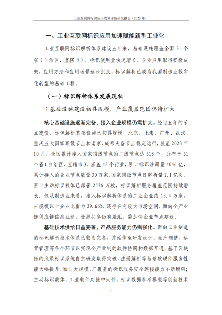 工业互联网标识解析体系是工业互联网的重要组成部分,是促进产业链上下游数据互通、提升产业链供应链韧性和安全水平的重要引擎。我国《中华人民共和国国民经济和社会发展第十四个五年规划和2035年远景目标纲要》明确提出打造自主可控的标识解析体系。2018年以来,在产学研用各方共同努力下,覆盖全国31个省的标识解析节点网络基本全面建成,标识使用量快速增长,企业应用取得积极成效,应用方法和应用场景逐步沉淀,标识解析逐步成为我国制造业数