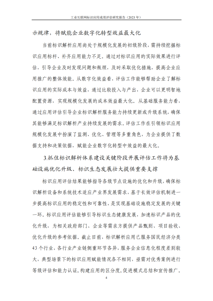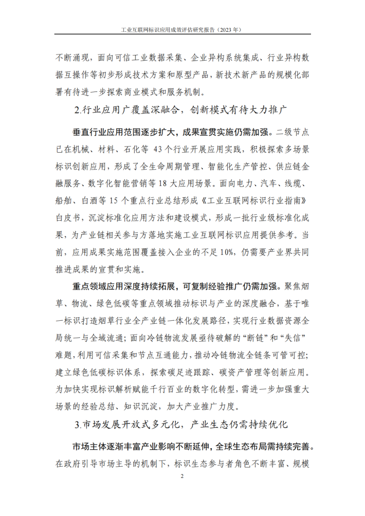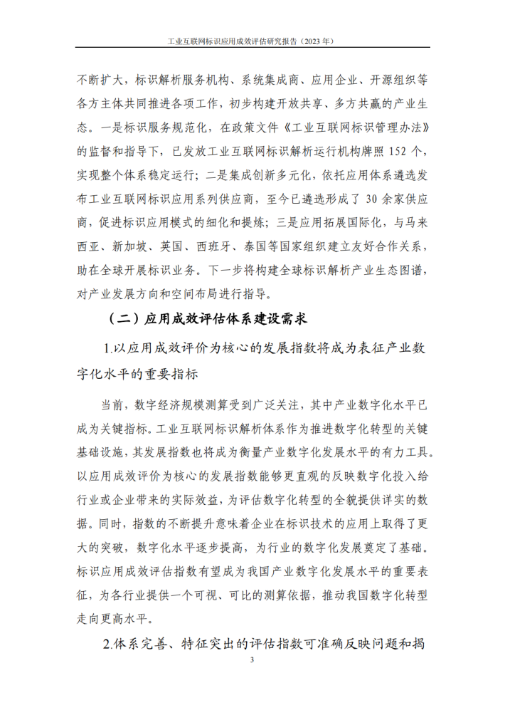 现阶段我国标识应用的规模化发展仍需持续推进,应用仍有较大发展空间,为加速推进标识应用生态培育,赋能我国工业高质量发展,《工业互联网标识应用成效评估研究报告》围绕标识应用产业发展需求,研究并构建应用成效评估体系、评估模型、指标体系、发展指数等,并按照全国各省抽样、行业广泛覆盖等原则选取100项重点应用实践进行数据收集与测算,评估发展阶段、总结应用特点、判断未来趋势,为我国标识解析基础设施建设和标识应用的推广与实施落地提供参考。