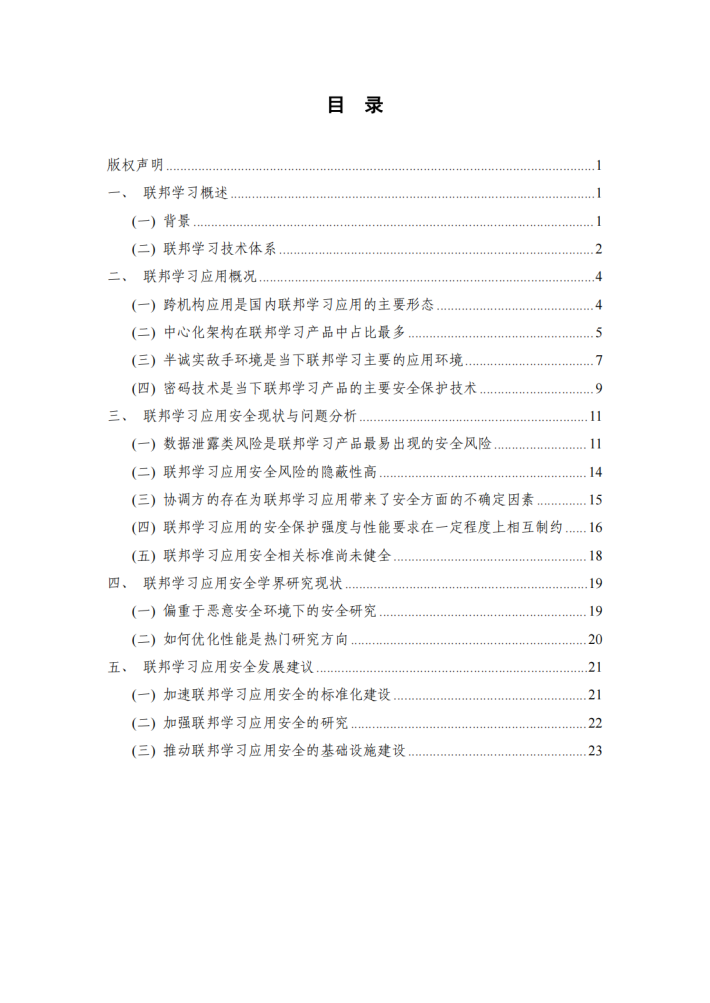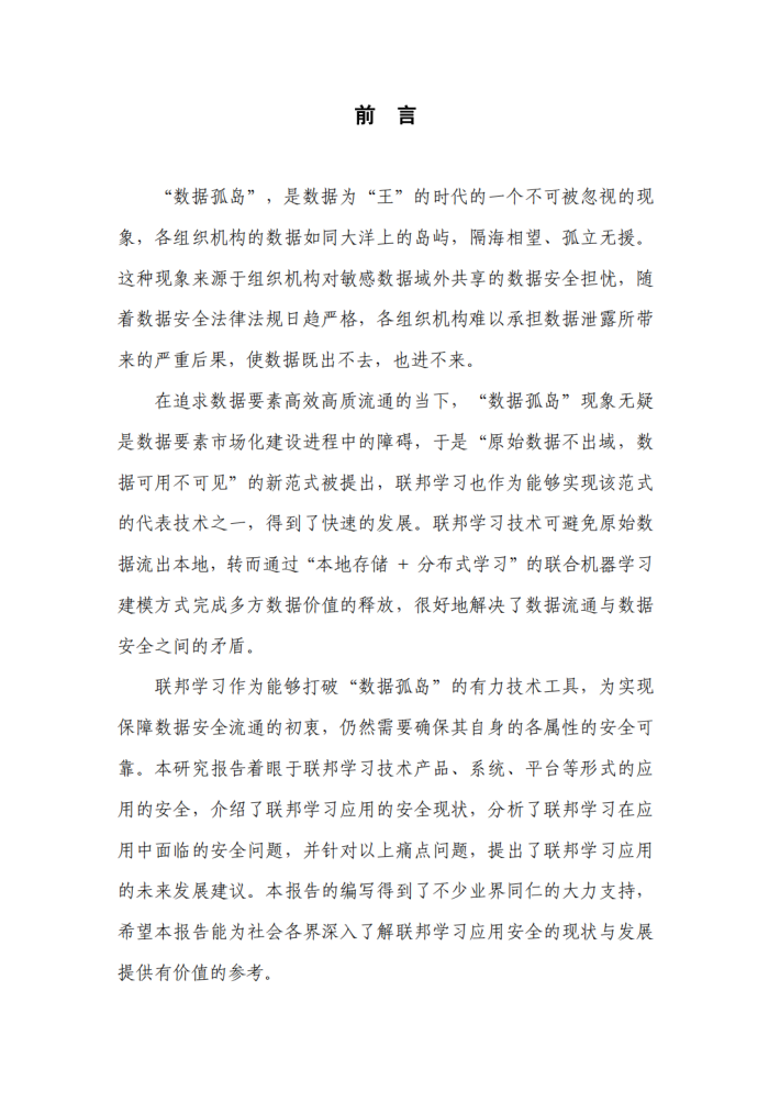 联邦学习作为能够打破“数据孤岛”的有力技术工具,为实现保障数据安全流通的初衷,仍然需要确保其自身的各属性的安全可靠。本研究报告着眼于联邦学习技术产品、系统、平台等形式的应用的安全,介绍了联邦学习应用的安全现状,分析了联邦学习在应用中面临的安全问题,并针对以上痛点问题,提出了联邦学习应用的未来发展建议。本报告的编写得到了不少业界同仁的大力支持,希望本报告能为社会各界深入了解联邦学习应用安全的现状与发展提供有价值的参考。
