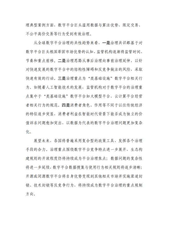 从全球数字平台治理的共性趋势来看,一是治理共识都基于对数字平台巨头根深蒂固市场优势的认知,监管机构逐渐将监管时间、节奏和重点前移。二是治理思路从事后治理向事前治理延伸,以针对快速发展的数字平台中的结构性障碍和反竞争做法的风险,采取快速有效的行动。三是治理重点为“类基础设施”数字平台相关行为。如随着人工智能技术的发展,监管机构对于数字平台的治理重点集中于“类基础设施”数字平台如大模型平台、云计算平台经营者相关行为的规范。四是消费者角色、作用等不同于以往传统经济的特征逐步突显,消费者利益在智能时代背景下能否成为独立的价值诉求问题愈加突出,以数据为代表的数字平台治理问题更加复杂化。