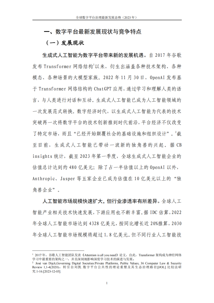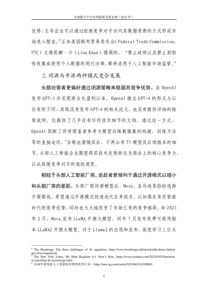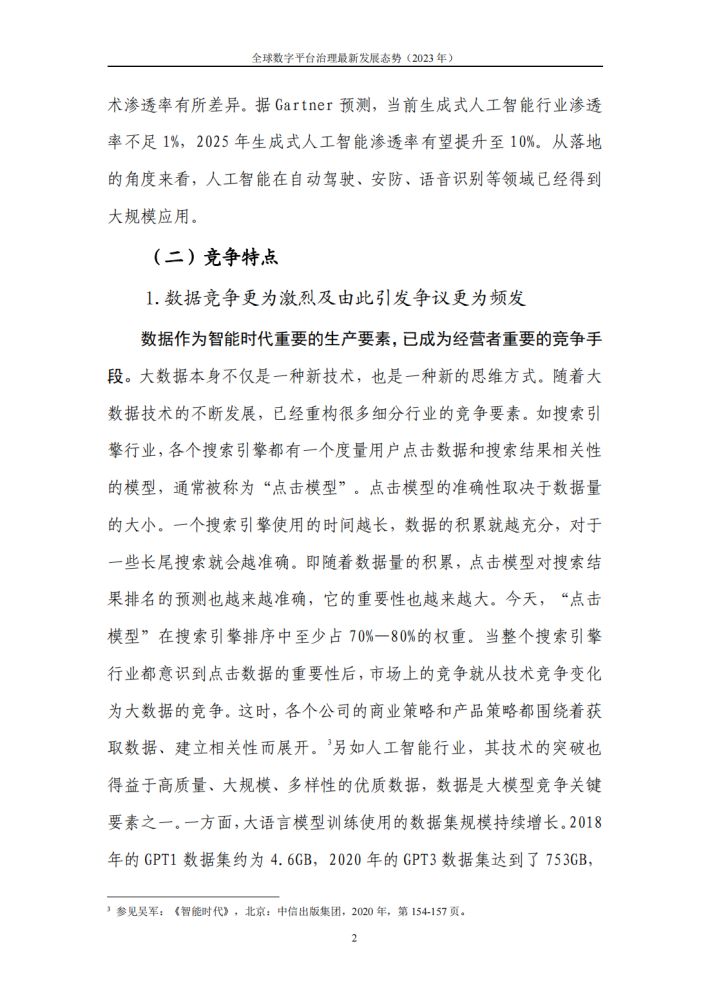 人工智能牵引智能时代加速到来,各类技术涌现以及众多企业接力创新的过程中,将给产业发展带来巨大的乘积效应。数字平台的竞争也随之呈现出新的特点:一是数据层面竞争更为激烈及由此引发的争议更为频发;二是闭源与开源两种创新模式竞合发展;三是超级平台企业成创新与价值网络的核心节点。