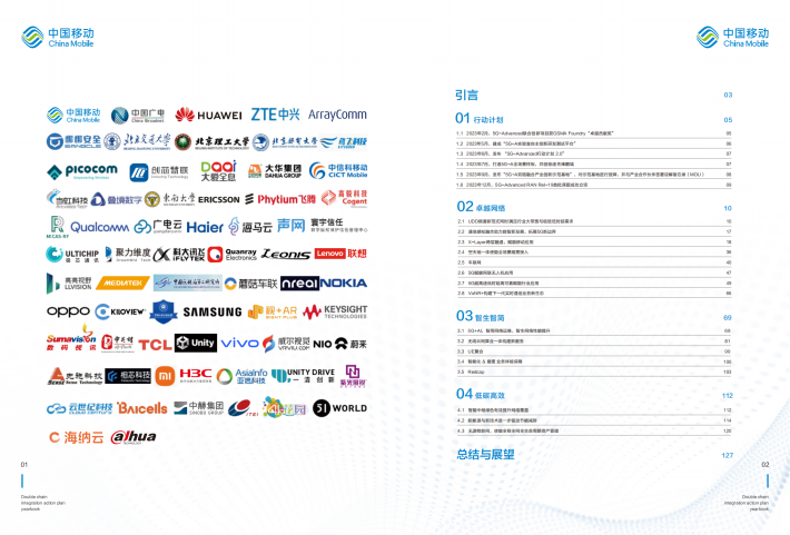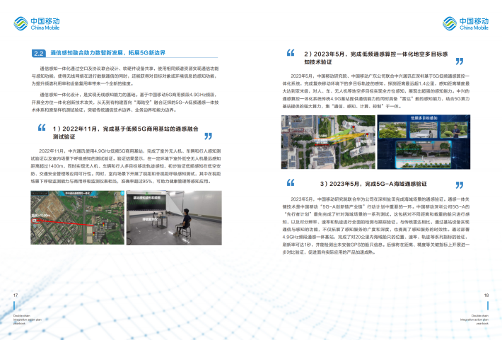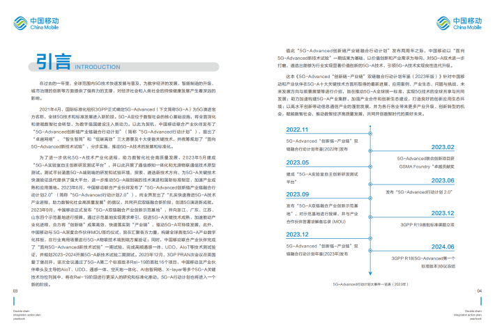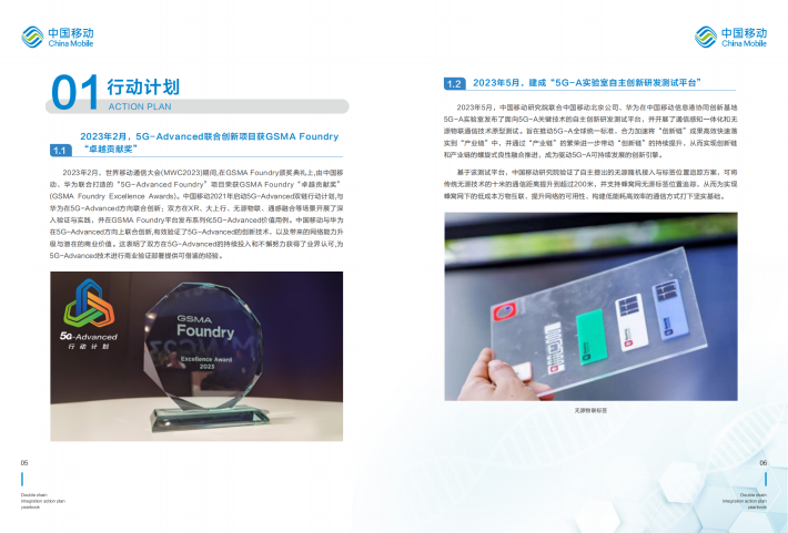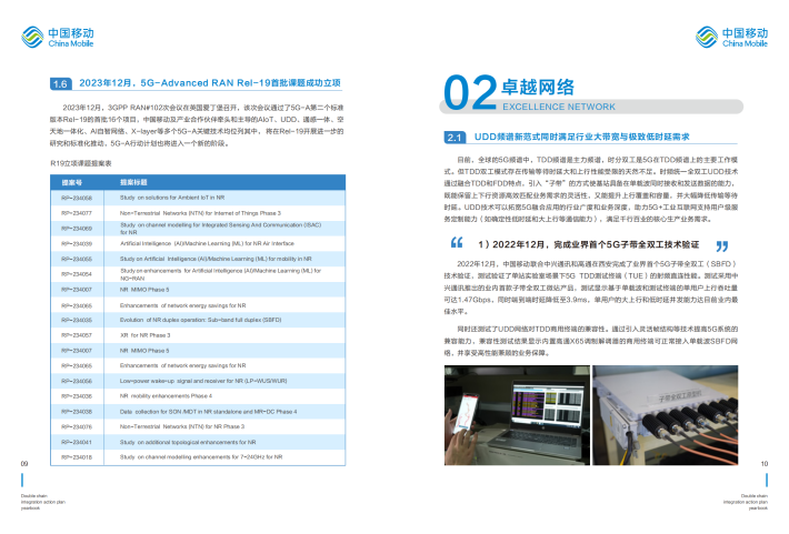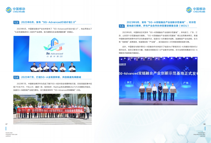 为了进一步优化5G-A技术产业化进程,助力数智化社会高质量发展,2023年5月建成“5G-A实验室自主创新研发测试平台”,并以此开展了通信感知一体化和无源物联通信技术原型测试。测试平台涵盖5G-A端到端的研发和试验环境,探索、遴选新技术方向,为5G-A关键技术快速验证迭代提供了强大平台,进一步推动5G-A端到端的技术演进和国际标准制定,加速产业成熟和应用落地。2023年6月,中国移动联合产业伙伴发布了“5G-Advanced创新链产业链融合行动计划2.0”(简称“5G-Advanced行动计划2.0”),向业界发出了“扎实快速推进5G-A技术产业进程,助力数智化社会高质量发展”的倡议,共同开启双链融合新阶段,创造5G演进新成就。2023年9月,中国移动正式发布“5G-A双链融合产业创新示范基地”,并向浙江、广东、江苏、山东四个示范基地进行授牌,通过示范基地实现需求牵引,促进5G-A关键技术成熟,加速推动产业化进程,合力将“创新链”成果高效、快速落实到“产业链”,驱动5G-A可持续发展,此外,中国移动与5G-A深度合作伙伴MOU签约仪式,旨在汇聚各方力量,构建全球首批5G-A产业数字化样板,在行业商用场景进行5G-A物联技术端到端方案验证;同时,中国移动联合产业伙伴完成了“面向5G-Advanced新技术试验”一期试验,完成高频通感一体、UDD、AloT等技术测试验证,并规划2023-2024开展5G-A新技术试验二期测试。2023年12月,3GP PRAN次会议在英国爱丁堡召开,该次会议通过了5G-A第二个标准版本Rel-19的首批16个项目,中国移动及产业伙伴牵头及主导的AloT、UDD、通感一体、空天地一体化、Al自智网络、X-layer等多个5G-A关键技术均位列其中,将在Rel-19阶段进行更深入的研究和标准化推动,5G-A行动计划也将进入一个新的阶段。