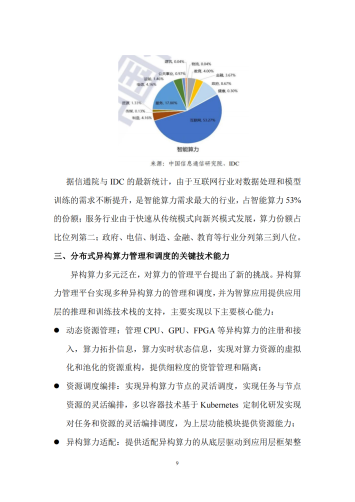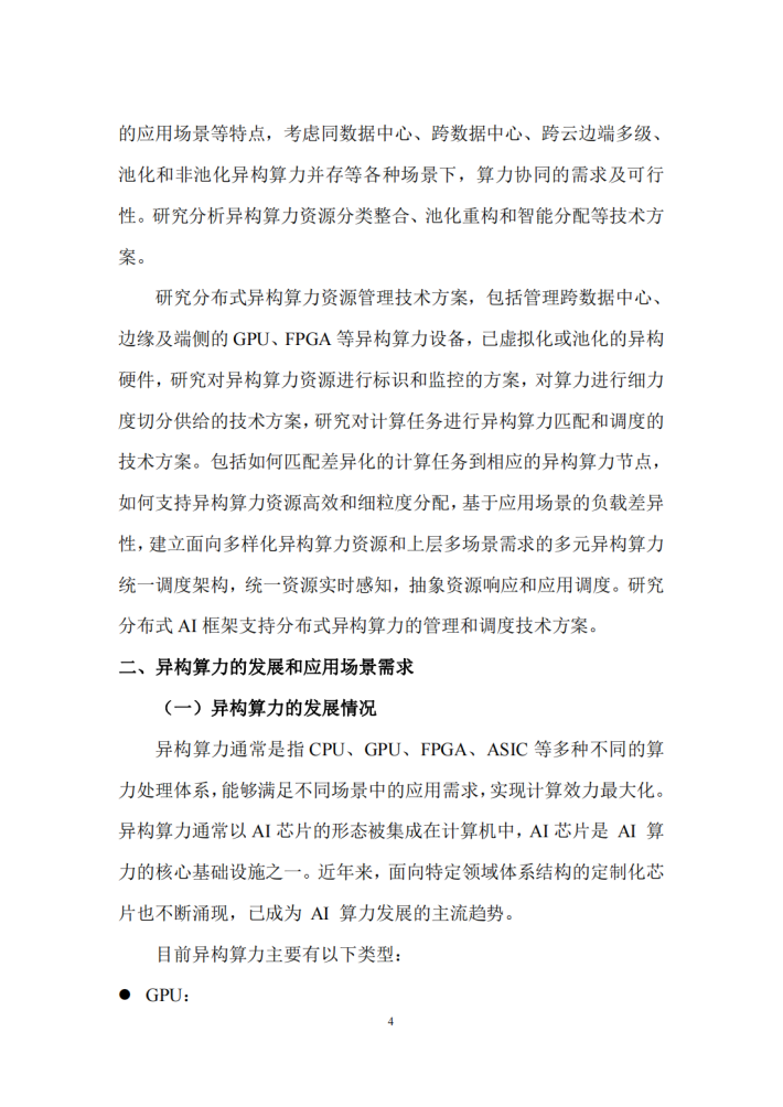 本研究围绕典型智能计算应用对异构算力的协同及调度需求,研究泛在异构算力参与训练或推理过程的协同需求、调度需求,研究泛在异构算力参与训练或推理过程的协同需求,包括异构算力类型、规模要求、性能要求、网络要求、数据传输要求等,分析异构算力协同的应用场景等特点,考虑同数据中心、跨数据中心、跨云边端多级、池化和非池化异构算力并存等各种场景下,算力协同的需求及可行性。研究分析异构算力资源分类整合、池化重构和智能分配等技术方案。