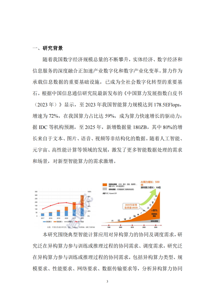 随着我国数字经济规模总量的不断攀升,实体经济、数字经济和信息服务的深度融合正加速产业数字化和数字产业化变革。算力作为承载信息数据的重要基础设施,已成为全社会数字化转型的重要基石。根据中国信息通信研究院最新发布的《中国算力发展指数白皮书(2023年)》显示,至2023年我国智能算力规模达到178.5EFlops,增速为72%,在我国算力占比达59%,成为算力快速增长的驱动力;据IDC等机构预测,至2025年,新增数据量180ZB,其中80%的增长来自于文本、图片、语音、视频等非结构化的数据。随着人工智能、元宇宙、高性能计算等领域的发展,激发了更多智能数据处理的需求和场景,对新型智能算力的需求激增。