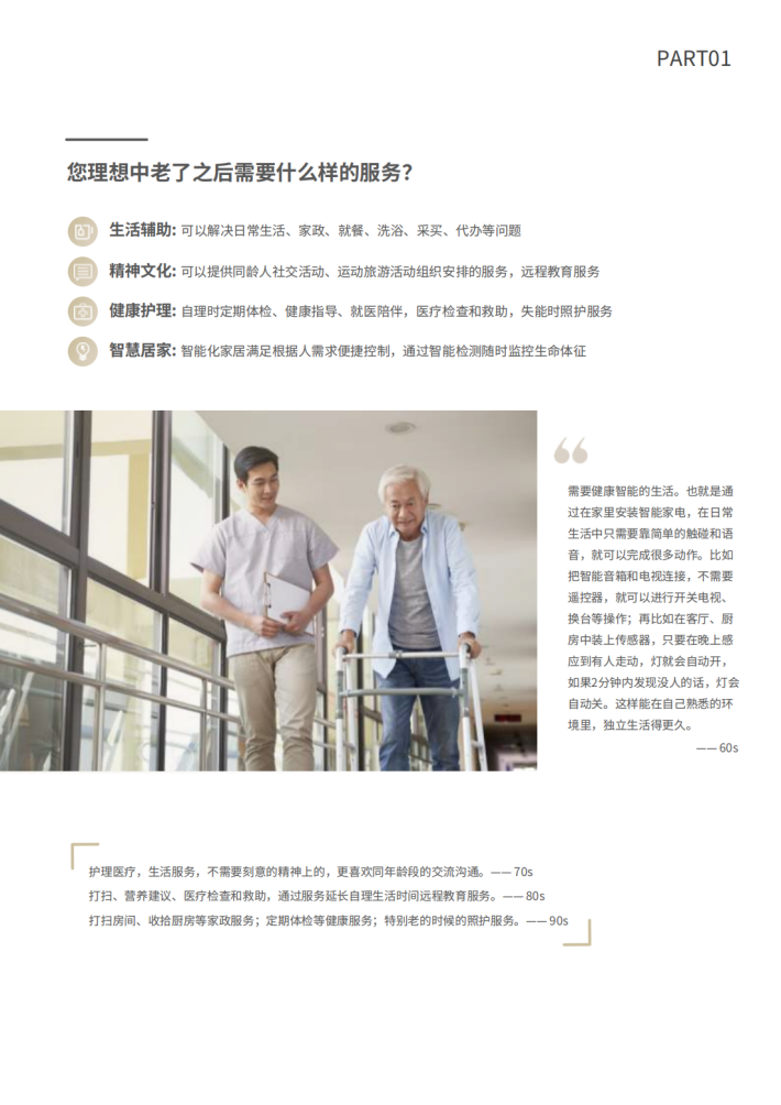 在身体障碍方面六成老年人在腿部和膝盖有困难,三成老年人存在要被困难问题,在疾病方面六成受访老年人患有骨关节病、三成患有心脑血管疾病,为老年人带来健康焦虑。老年人期待更多家庭健康管理产品,能够更好的辅助其进行居家健康自检、监测和护理。