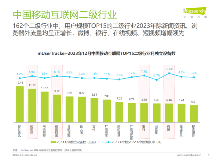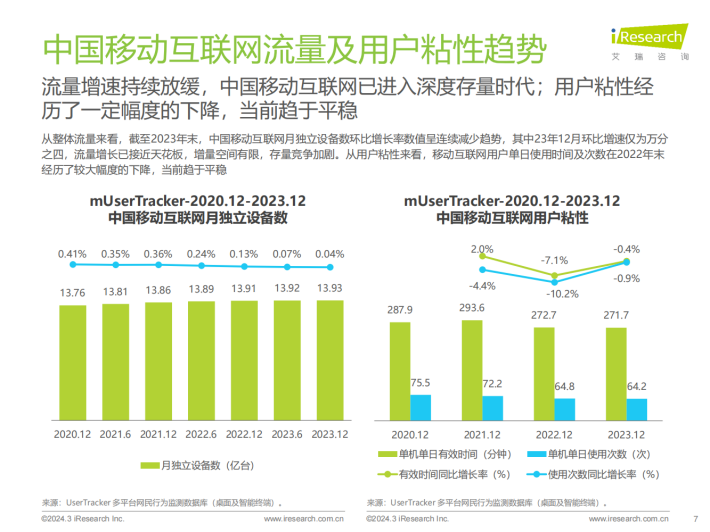 用户规模趋于饱和,增速放缓:截至2023年12月,中国移动互联网月独立设备数达13.93亿台,与年中相比仅增长了微小的万分之四;网民人均单日使用时长为271.7分钟、人均单日使用次数为64.2次,线上粘性同比负增长。这意味着市场已经进入了更为成熟和饱和的阶段,增量空间有限,竞争焦点已经转向深度挖掘存量用户的价值。尽管整体市场趋于饱和,但仍有部分细分领域展现出较大的增长空间。