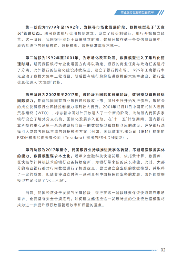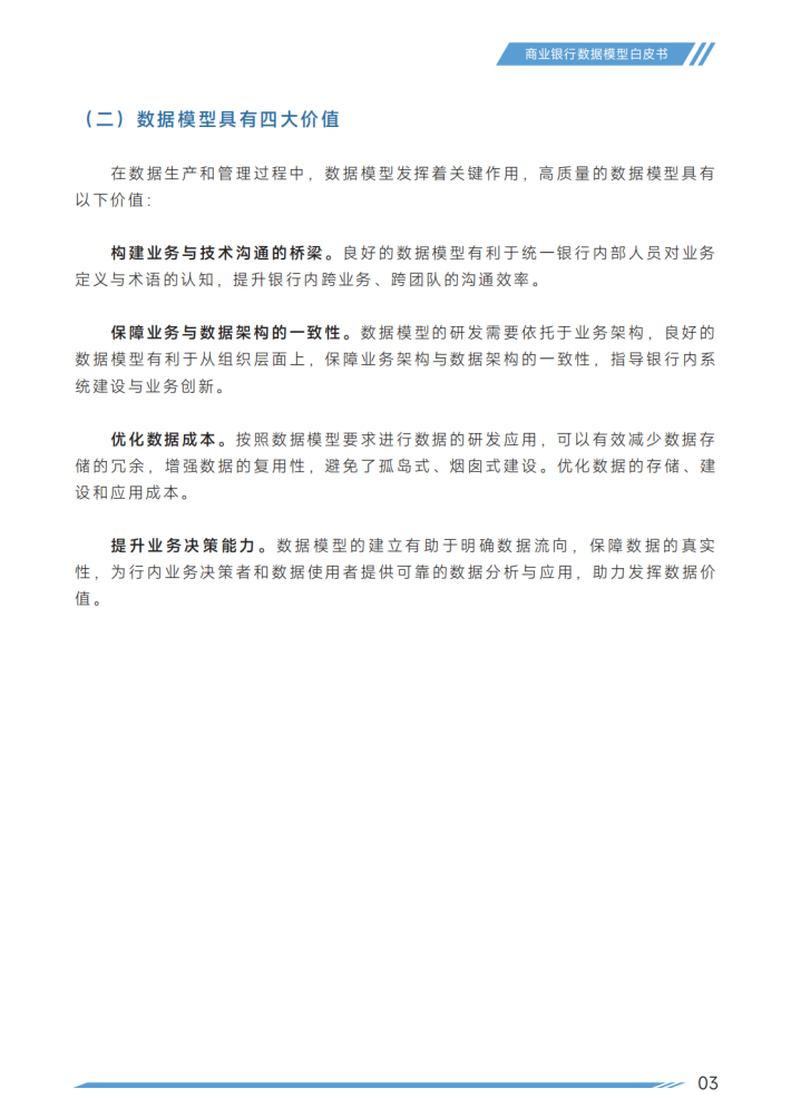 数据模型建设是推动高质量数据治理体系的核心环节。银行业作为早期开展数字化转型的行业,在取得了诸多显著的成果同时,也暴露出了一些问题。在银行的数据管理模式从粗放式扩张向集约式管理转变的过程中,出现了数据架构、数据质量等方面的问题。例如,数据质量无法满足运营安全要求,数据架构难以支撑业务创新需求等。构建企业级数据模型可以帮助银行厘清数据分布关系,优化数据架构,确保数据的一致性、完整性和易用性,进而提升数据应用效率,激发数据的业务价值。