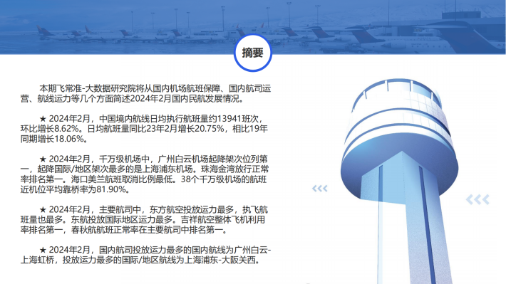 本期飞常准-大数据研究院将从国内机场航班保障、国内航司运营、航线运力等几个方面简述2024年2月国内民航发展情况。