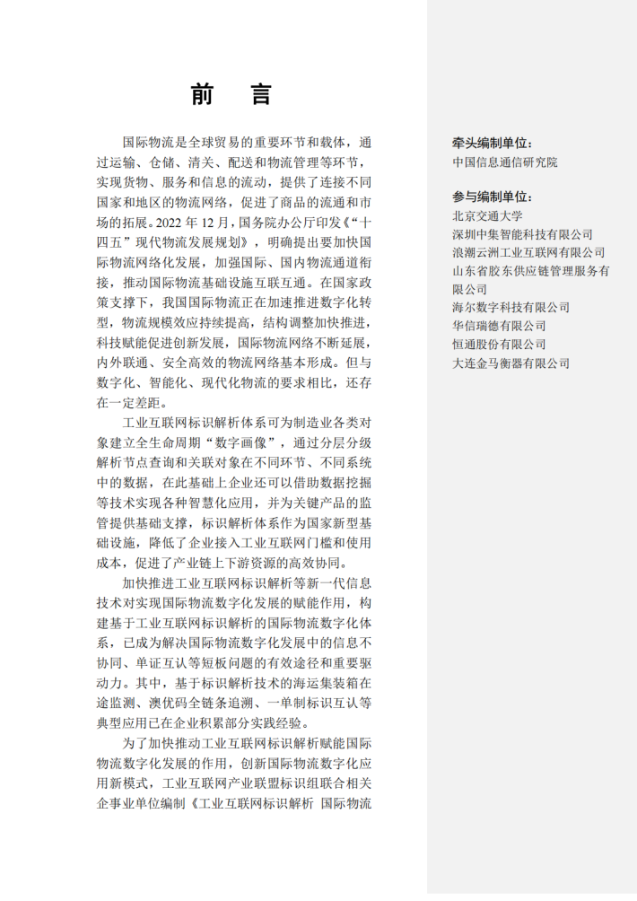 加快推进工业互联网标识解析等新一代信息技术对实现国际物流数字化发展的赋能作用,构建基于工业互联网标识解析的国际物流数字化体系,已成为解决国际物流数字化发展中的信息不协同、单证互认等短板问题的有效途径和重要驱动力。其中,基于标识解析技术的海运集装箱在途监测、澳优码全链条追溯、一单制标识互认等典型应用已在企业积累部分实践经验。