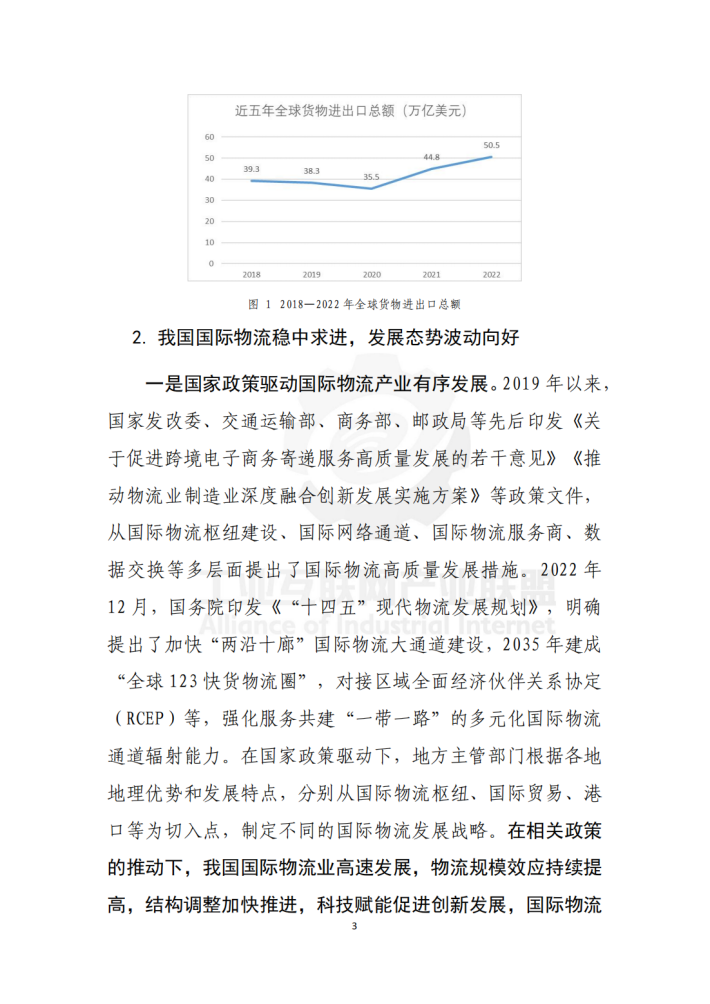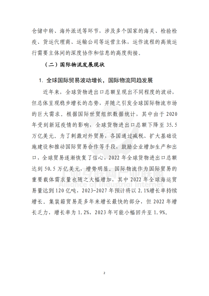 国际物流是全球贸易的重要环节和载体,通过运输、仓储、清关、配送和物流管理等环节,实现货物、服务和信息的流动,提供了连接不同国家和地区的物流网络,促进了商品的流通和市场的拓展。2022年12月,国务院办公厅印发《“十四五”现代物流发展规划》,明确提出要加快国际物流网络化发展,加强国际、国内物流通道衔接,推动国际物流基础设施互联互通。在国家政策支撑下,我国国际物流正在加速推进数字化转型,物流规模效应持续提高,结构调整加快推进,科技赋能促进创新发展,国际物流网络不断延展,内外联通、安全高效的物流网络基本形成。但与数字化、智能化、现代化物流的要求相比,还存在一定差距。