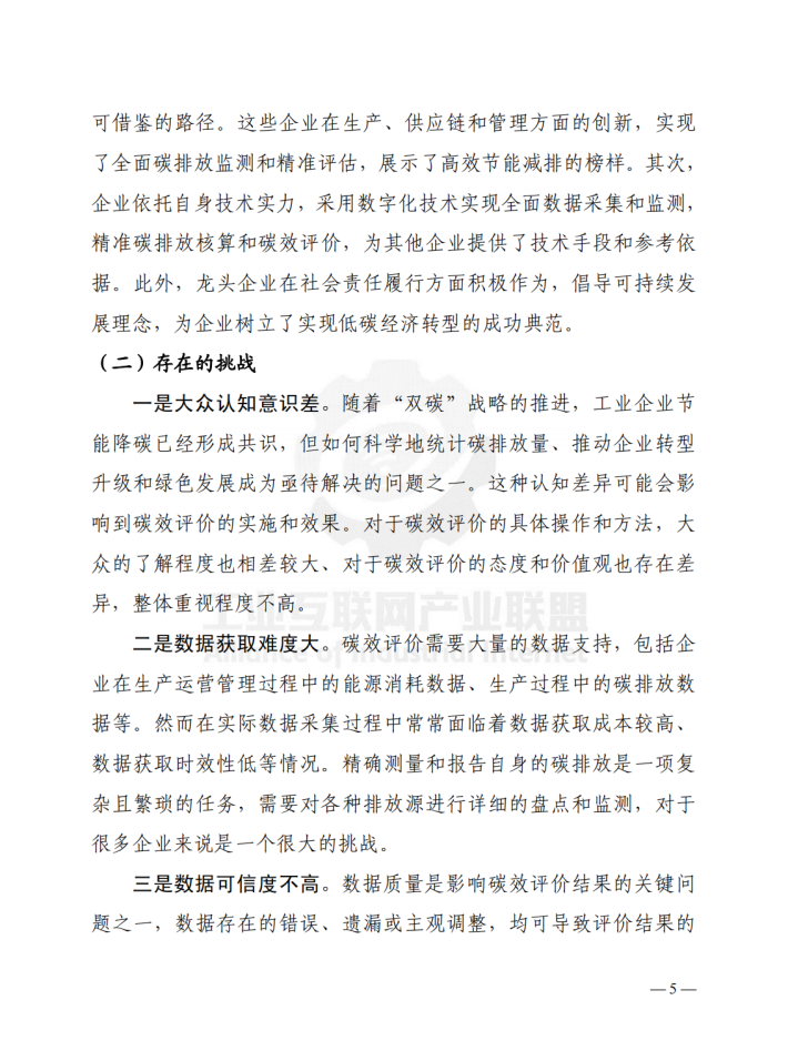 为贯彻落实《工业互联网专项工作组2023年工作计划》要求、加速推进工业互联网标识解析等新一代信息技术对实现绿色低碳发展的赋能作用,前期提出了绿色低碳标识体系,并发布了《绿色低碳标识白皮书》。本白皮书重在基于绿色低碳标识的企业碳效评价实践探索和应用研究,通过分析企业开展碳效评价背景和意义、面临的机遇和挑战,提出碳效评价方案,面向建材、化工、钢铁、汽车制造等重点行业开展实践应用探索,并给出企业碳效评价和绿色低碳发展的策略建议。