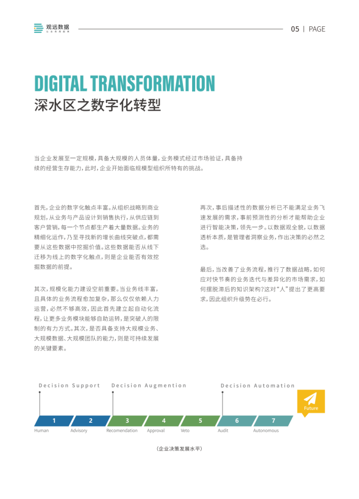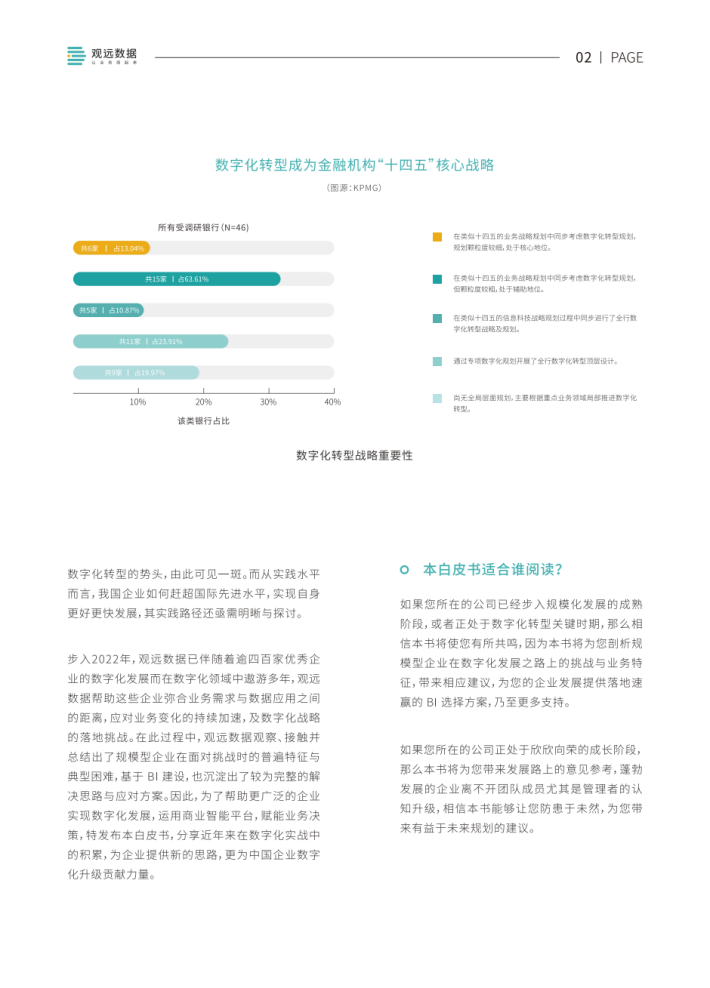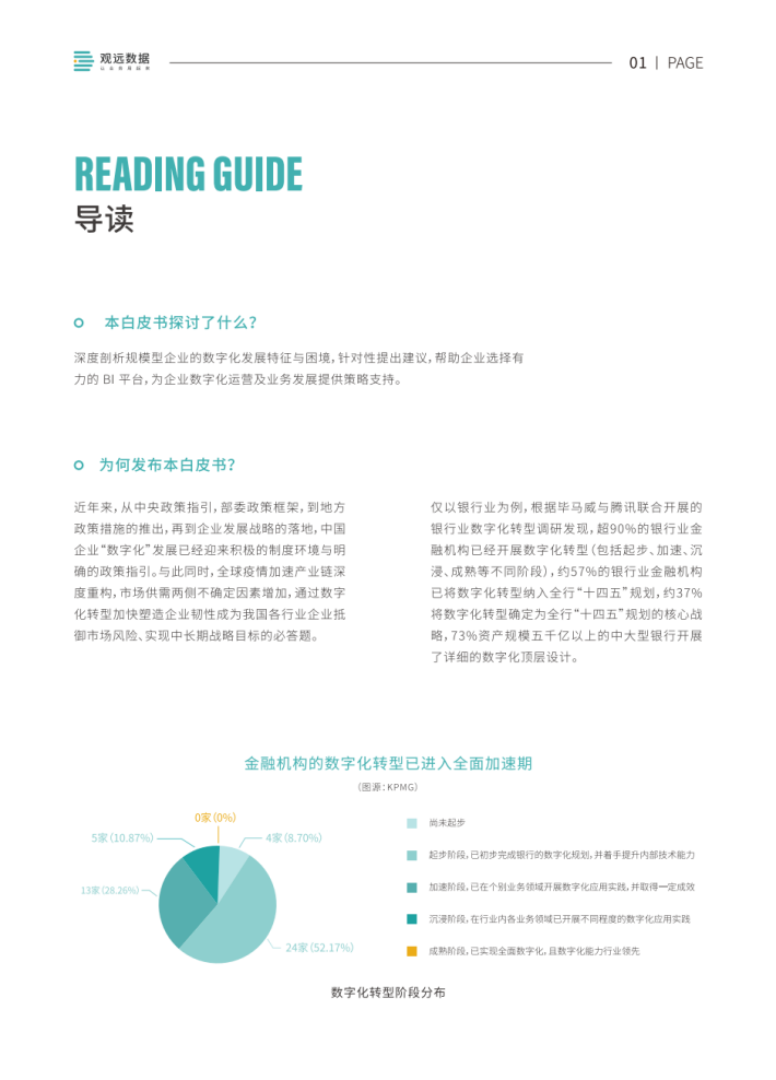 仅以银行业为例,根据毕马威与腾讯联合开展的银行业数字化转型调研发现,超90%的银行业金融机构已经开展数字化转型(包括起步、加速、沉浸、成熟等不同阶段),约57%的银行业金融机构已将数字化转型纳入全行“十四五”规划,约37%将数字化转型确定为全行“十四五”规划的核心战略,73%资产规模五千亿以上的中大型银行开展了详细的数字化顶层设计。