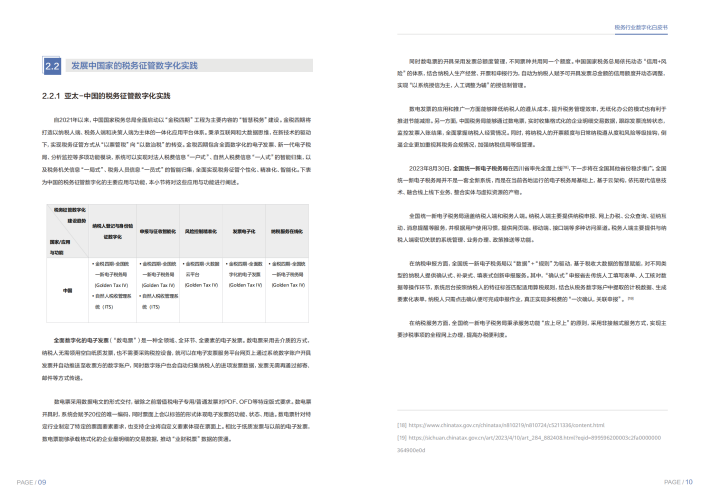 我们精选了全球各个地区中的8个典型国家税务数字化转型的实践案例,梳理数字化转型的脉络和关键要素,从纳税人管理、申报征收、风险监控、发票管理、纳税服务等几个方面的数字化发展方向进行研究。例如,新加坡作为发达国家,在税务征管数字化领域已采取多种数字化举措,实现了纳税人登记与身份验证数字化、申报与征收智能化、风险控制精准化、纳税服务在线化并且将继续利用数据、科学和人工智能以更好地服务纳税人并增强其合规能力;中国作为发展中国家,在税务征管数字化领域启动了以“金税四期”工程为主要内容的“智慧税务”建设,实现了税务征管方式从“以票管税”向“以数治税”的转变。我们也看到近年来尼日利亚、肯尼亚、喀麦隆等非洲国家的数字化转型已经成为其税务管理发展的重要方向。