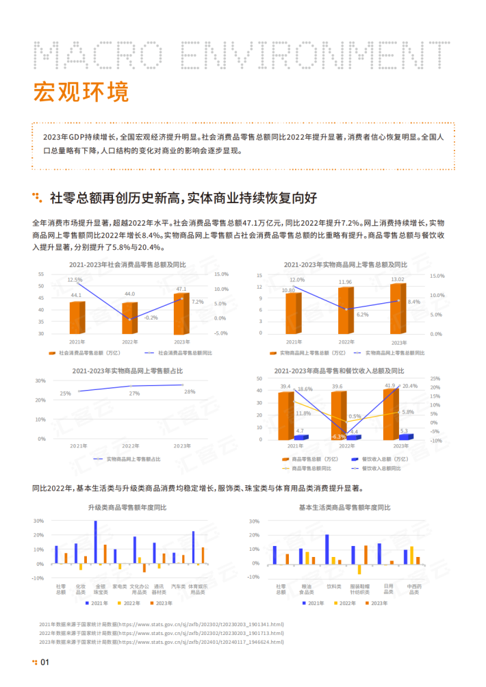2023年是全面贯彻党的二十大精神的开局之年,是三年新冠疫情防控转段后经济恢复发展的一年。国家出台了多项促进消费的政策,经济和消费等各方面均回暖复苏。经济运行恢复向好,社会消费品零售总额大幅反弹,全国餐饮收入更是强势增长。作为实体商业人气晴雨表的全国购物中心客流增长超两成,全国实体商业充满韧性和活力。