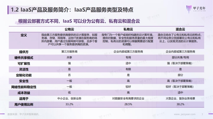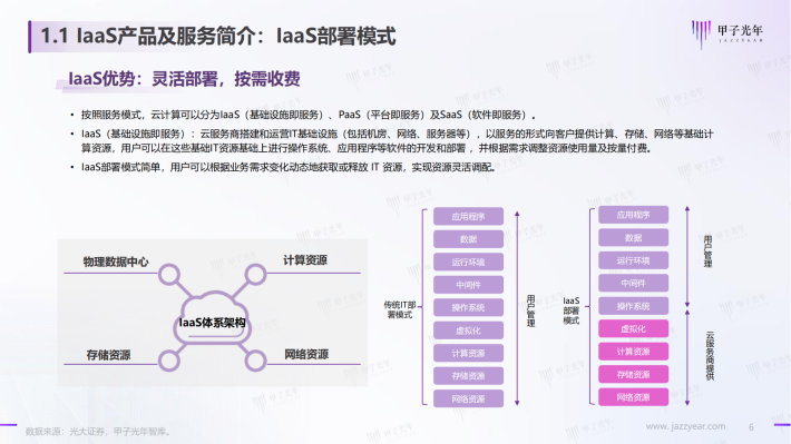 laaS(基础设施即服务):云服务商搭建和运营IT基础设施(包括机房、网络、服务器等),以服务的形式向客户提供计算、存储、网络等基础计算资源,用户可以在这些基础IT资源基础上进行操作系统、应用程序等软件的开发和部署,并根据需求调整资源使用量及按量付费。laaS部署模式简单,用户可以根据业务需求变化动态地获取或释放IT资源,实现资源灵活调配。