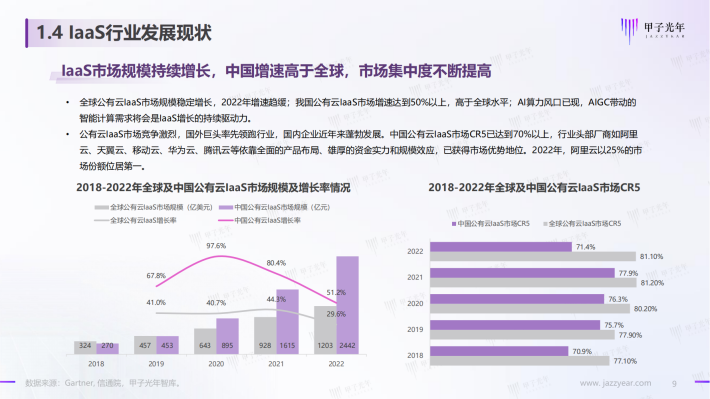 全球公有云laaS市场规模稳定增长,2022年增速趋缓;我国公有云laaS市场增速达到50%以上,高于全球水平;Al算力风口已现,AlGC带动的智能计算需求将会是laaS增长的持续驱动力。