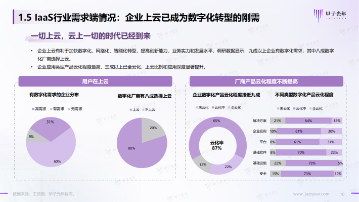 企业上云有利于加快数字化、网络化、智能化转型,提高创新能力,业务实力和发展水平,调研数据显示,九成以上企业有数字化需求,其中八成数字化厂商选择上云。企业应用类型产品云化程度最高,三成以上已全云化,上云比例和应用深度显著提升。