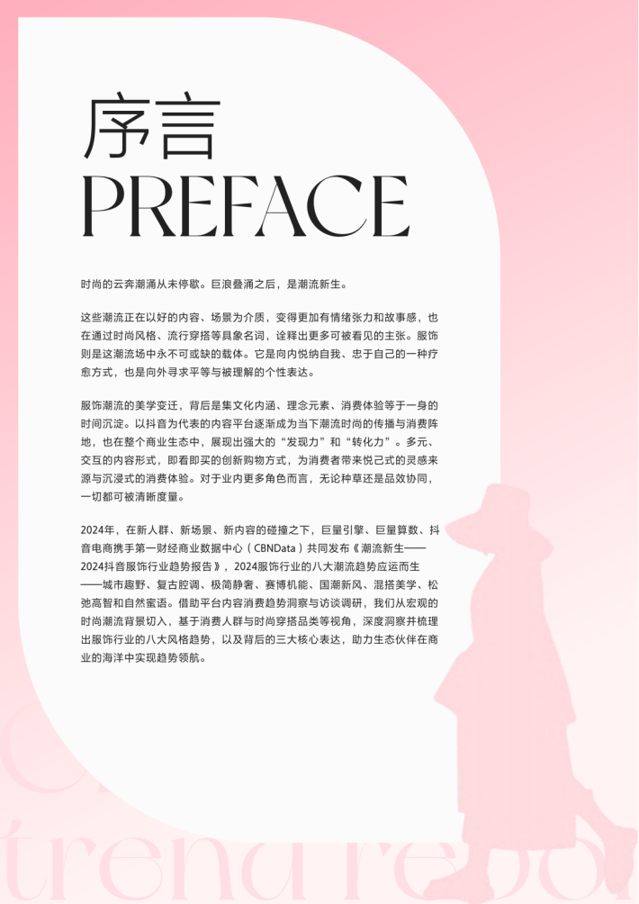 音电商携手第一财经商业数据中心(CBNData)共同发布《潮流新生——2024抖音服饰行业趋势报告》,2024服饰行业的八大潮流趋势应运而生——城市趣野、复古腔调、极简静奢、赛博机能、国潮新风、混搭美学、松弛高智和自然蜜语。借助平台内容消费趋势洞察与访谈调研,我们从宏观的时尚潮流背景切入,基于消费人群与时尚穿搭品类等视角,深度洞察并梳理出服饰行业的八大风格趋势,以及背后的三大核心表达,助力生态伙伴在商业的海洋中实现趋势领航。