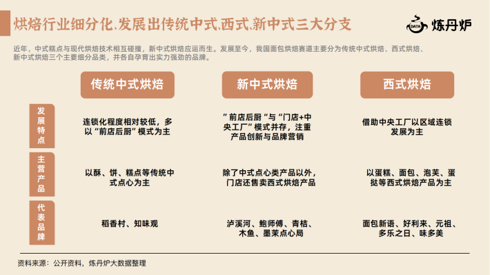 近年,中式糕点与现代烘焙技术相互碰撞,新中式烘焙应运而生。发展至今,我国面包烘焙赛道主要分为传统中式烘焙、西式烘焙、新中式烘焙三个主要细分品类,并各自孕育出实力强劲的品牌。