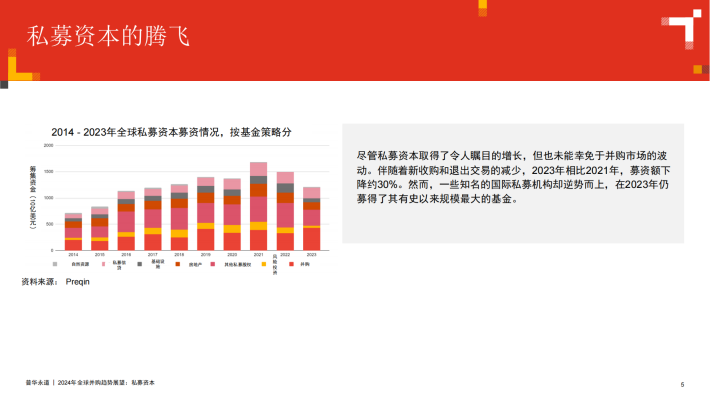 2024年初,伴随着通胀趋缓、利率预期下调以及股市近期的上扬,我们相信,并购活动复苏的钟声已经敲响。这对于手持创纪录可投资金的私募资本而言是个好消息,但同时,普通合伙人(GP)在投资和分配方面也面临着来自于有限合伙人(LP)越来越大的压力。私募资本的资产管理规模(AUM)已达到12万亿美元,较2019年几乎翻番。这说明了私募资本的未兑现盈利已大量累积,也表明了许多投资亟需退出变现。我们预计,未来12个月内市场上将出现不少待售资产。