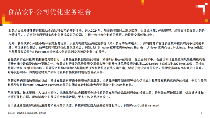 尽管不同地区和国家的情况各不相同,但结合近期的通货膨胀数据,以及各国央行发出的2024年利率可能持平或下降的信号来看,全球投资者有望恢复信心。从消费端来看,消费者信心和支出水平可能需要更长时间修复。对消费企业而言,在经历了两年成本快速上涨和相应提价后,企业应对通胀放缓及随之而来的定价压力的能力,将至少在短期内影响其盈利性,进而影响其并购活动的积极性。从中长期来看,我们对全球消费市场并购活动的全面恢复持较为乐观的态度。