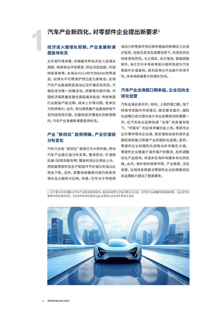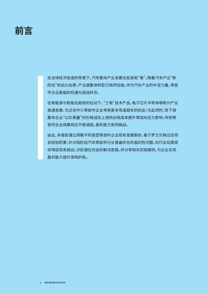 由此,本报告通过洞察不同类型零部件企业现有发展掣肘,基于罗兰贝格过往项目经验积累,针对现阶段汽车零部件行业普遍存在的盈利性问题,向行业玩家提供驾驭现有挑战、识别潜在机会的解决思路,并分享相关实践案例,为企业实现盈利能力提升保驾护航。