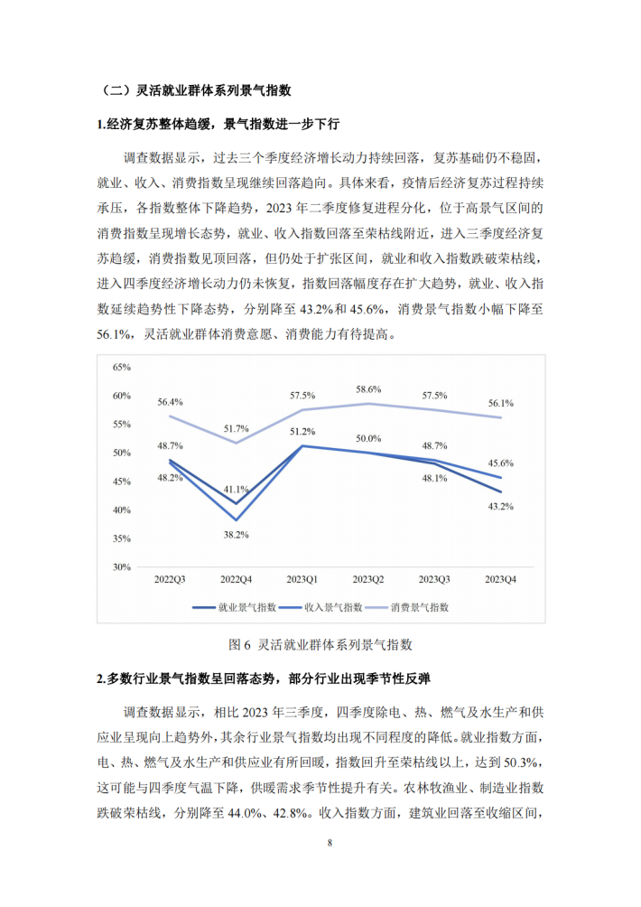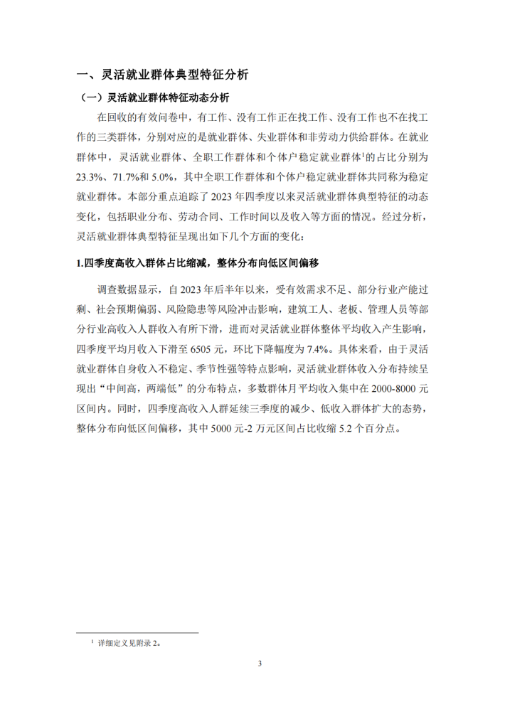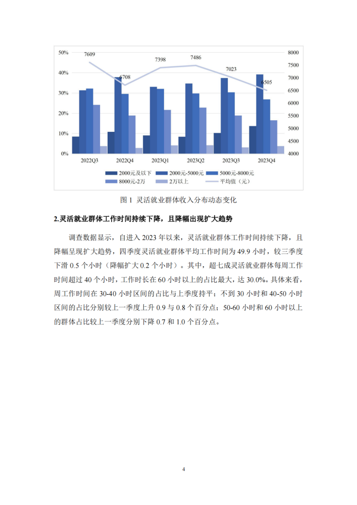 第四季度灵活就业群体的平均收入为6505元,环比下降7.4%;其次,本季度灵活就业群体的平均工作时间为49.9小时,与上季度相比减少0.5小时,降幅约为1.0个百分点;再次,灵活就业群体职业分布总体保持稳定,其中传统灵活就业群体仍占主体地位,生产制造工人和线下生活服务人员占比分别为16.7%和19.7%,与三季度相比,生产制造工人占比下降1.5个百分点,而线下生活服务人员则环比上涨1.5个百分点;最后,在灵活就业群体的合同稳定性方面,与三季度相比,第四季度灵活就业群体的稳定性降低,长期稳定合同环比下降1.4个百分点,而没有合同和短期/临时合同的合计占比环比上升2.2个百分点。