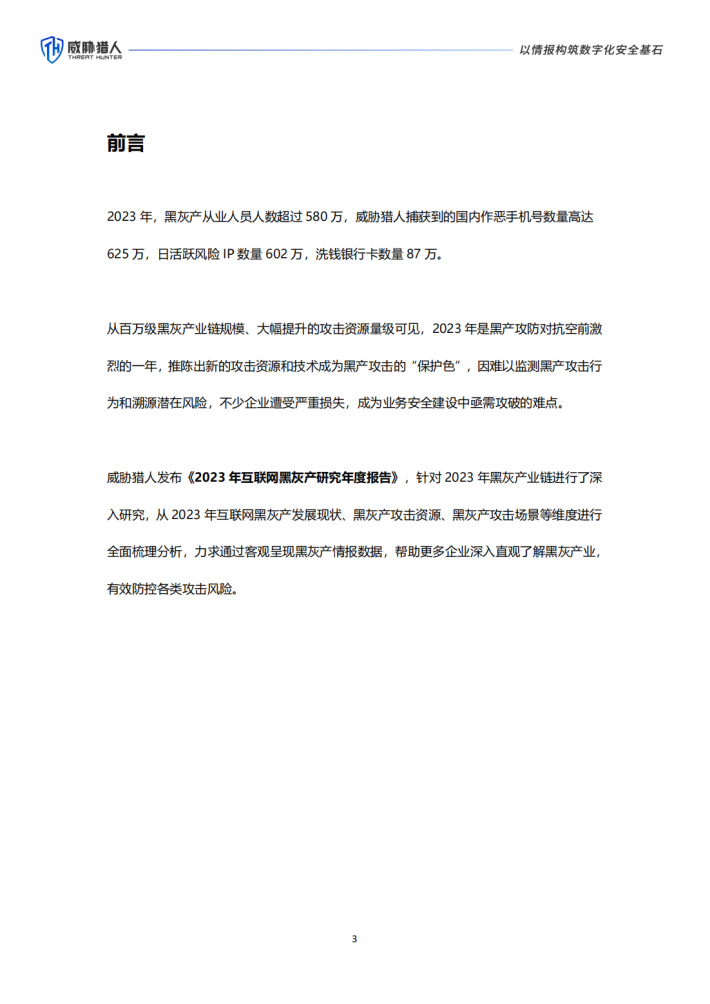 2023年,黑灰产从业人员人数超过580万,威胁猎人捕获到的国内作恶手机号数量高达625万,日活跃风险IP数量602万,洗钱银行卡数量87万。