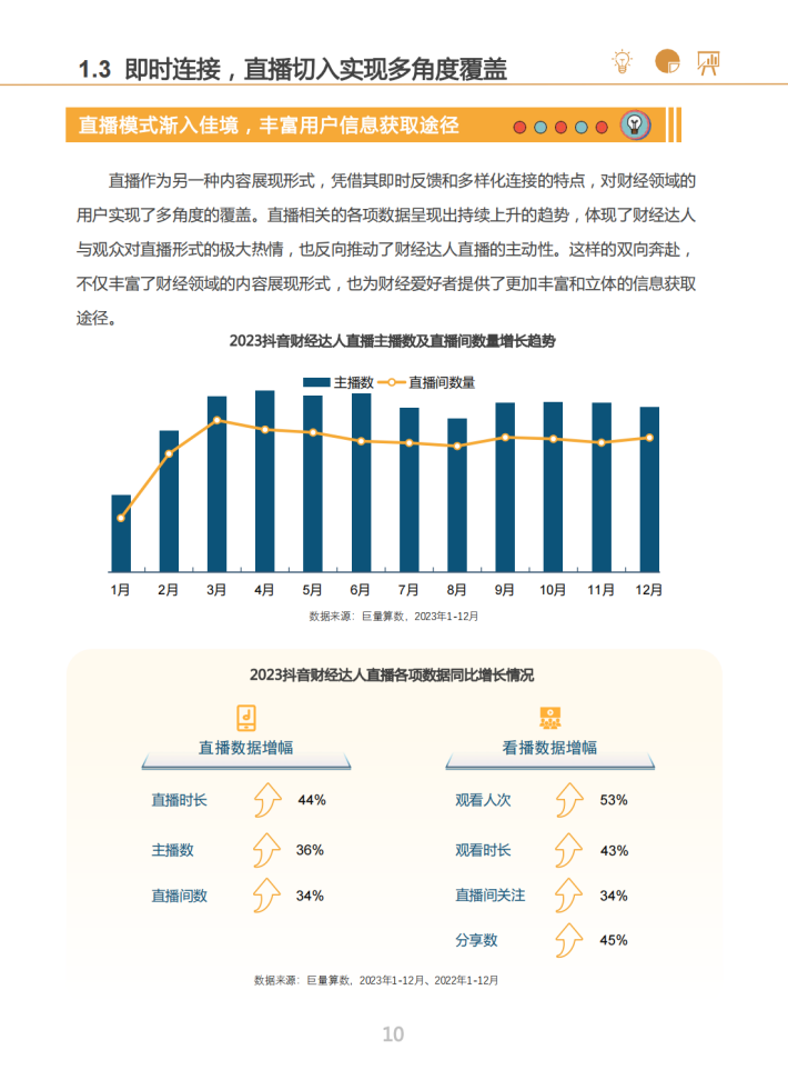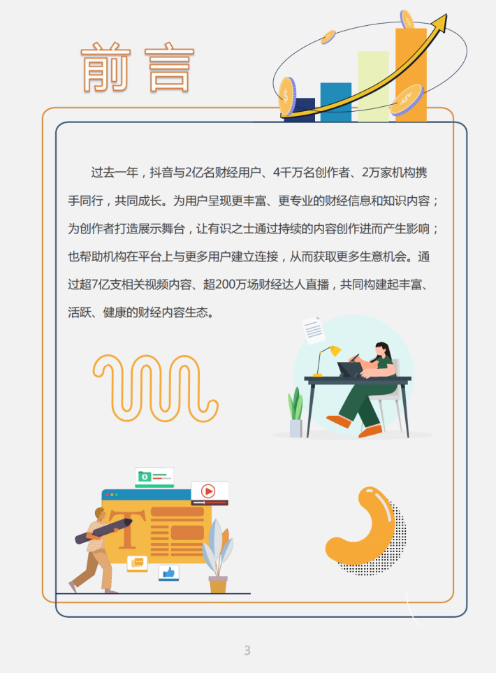 过去一年,抖音与2亿名财经用户、4千万名创作者、2万家机构携手同行,共同成长。为用户呈现更丰富、更专业的财经信息和知识内容;为创作者打造展示舞台,让有识之士通过持续的内容创作进而产生影响;也帮助机构在平台上与更多用户建立连接,从而获取更多生意机会。通过超7亿支相关视频内容、超200万场财经达人直播,共同构建起丰富、活跃、健康的财经内容生态。