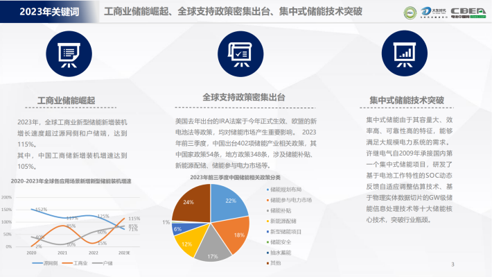 美国去年出台的IRA法案于今年正式生效、欧盟的新电池法等政策,均对储能市场产生重要影响。 2023年前三季度,中国出台402项储能产业相关政策,其中国家政策54条,地方政策348条,涉及储能补贴、新能源配储、储能参与电力市场等。