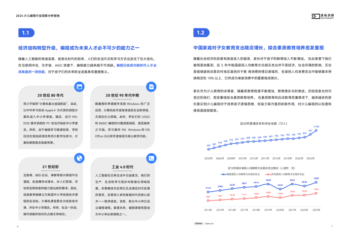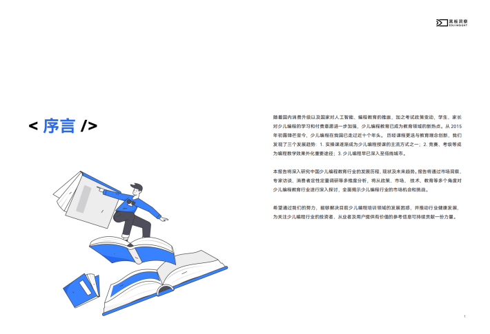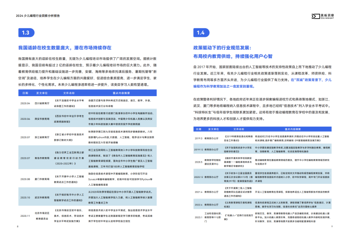本报告将深入研究中国少儿编程教育行业的发展历程、现状及未来趋势。报告将通过市场洞察、专家访谈、消费者定性定量调研等多维度分析,将从政策、市场、 技术、教育等多个角度对少儿编程教育行业进行深入探讨,全面揭示少儿编程行业的市场机会和挑战。