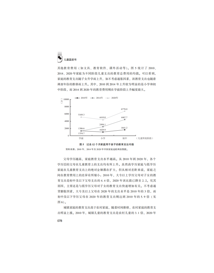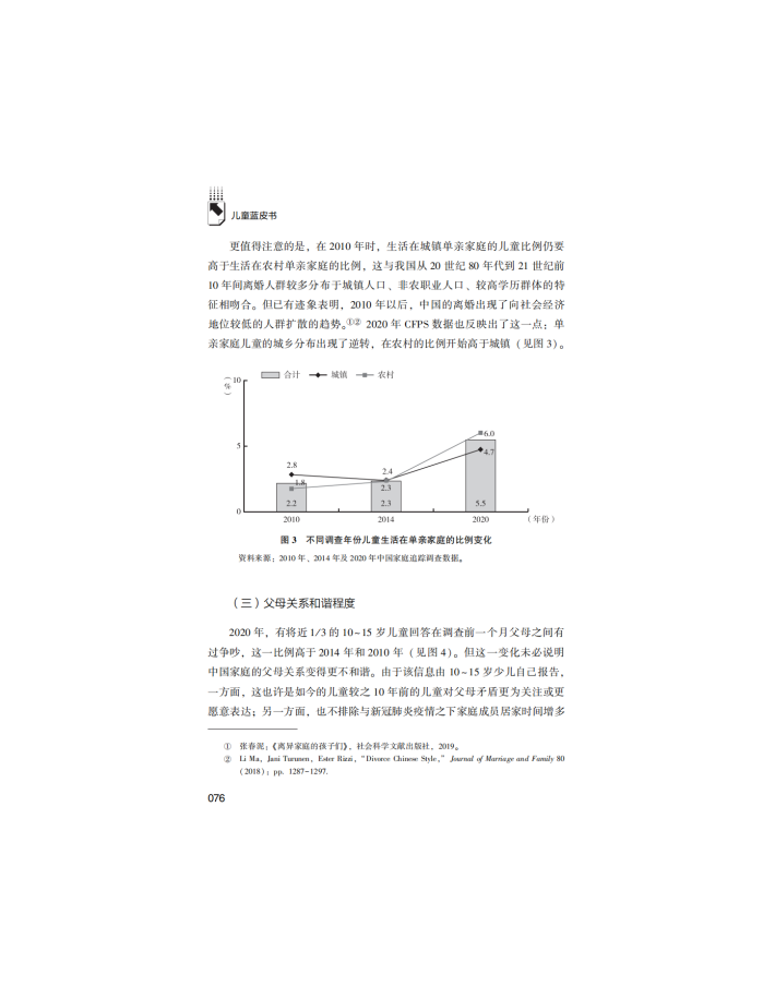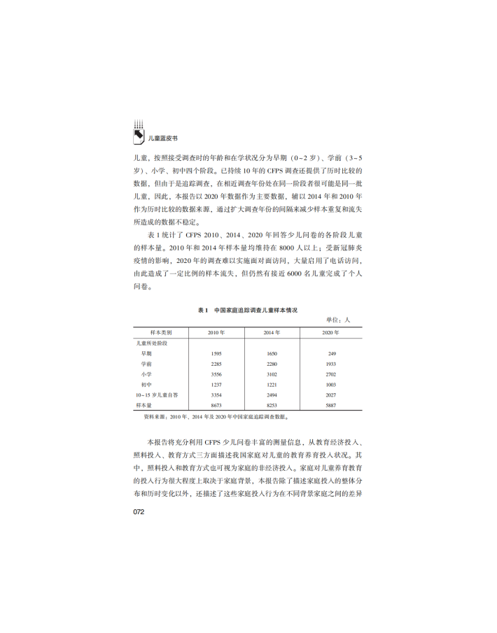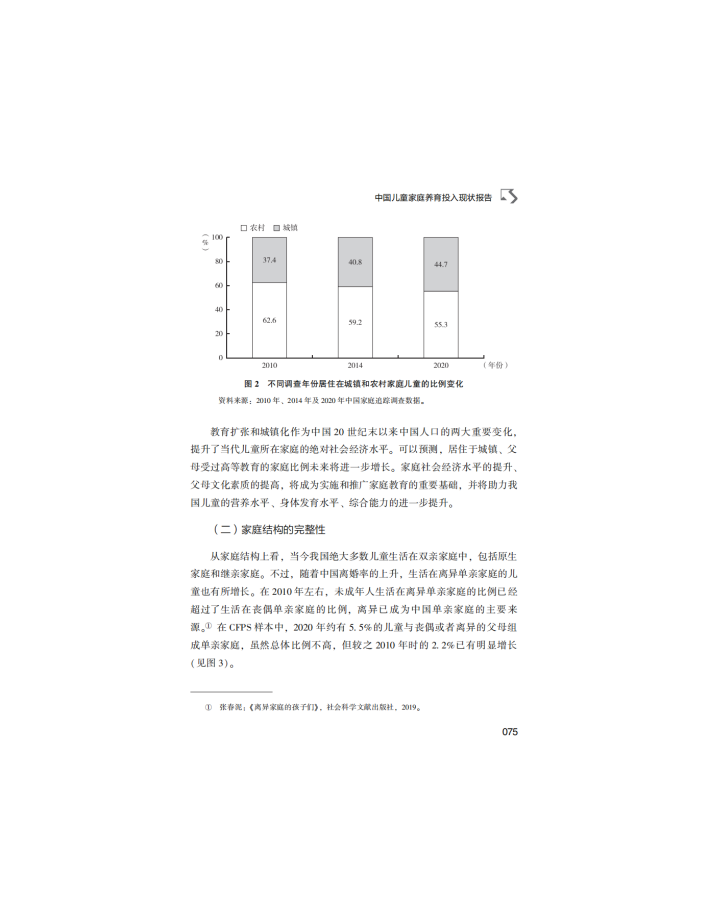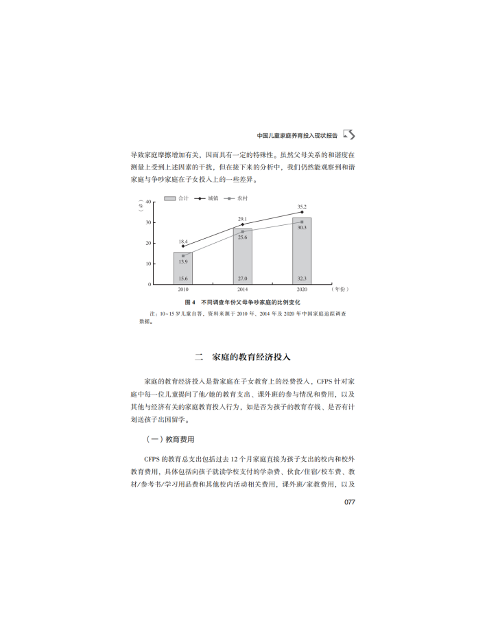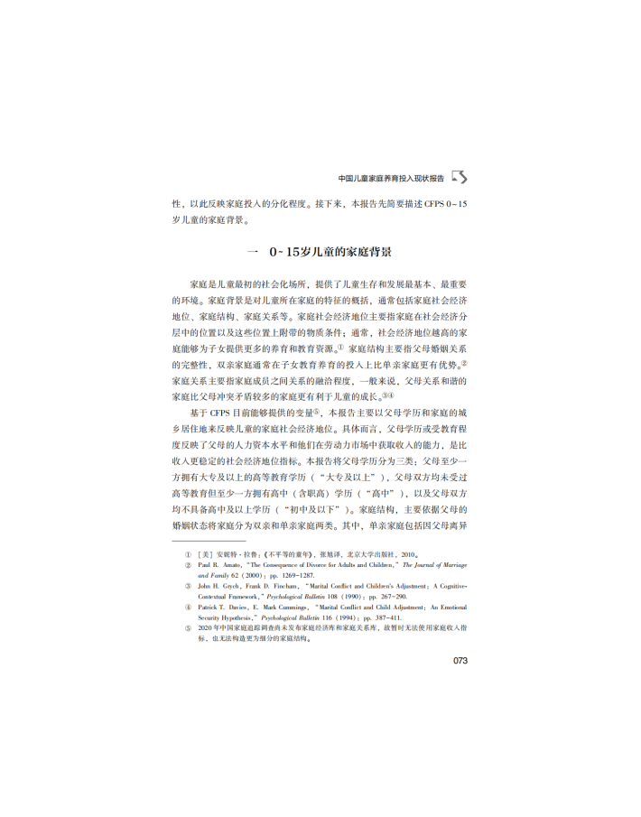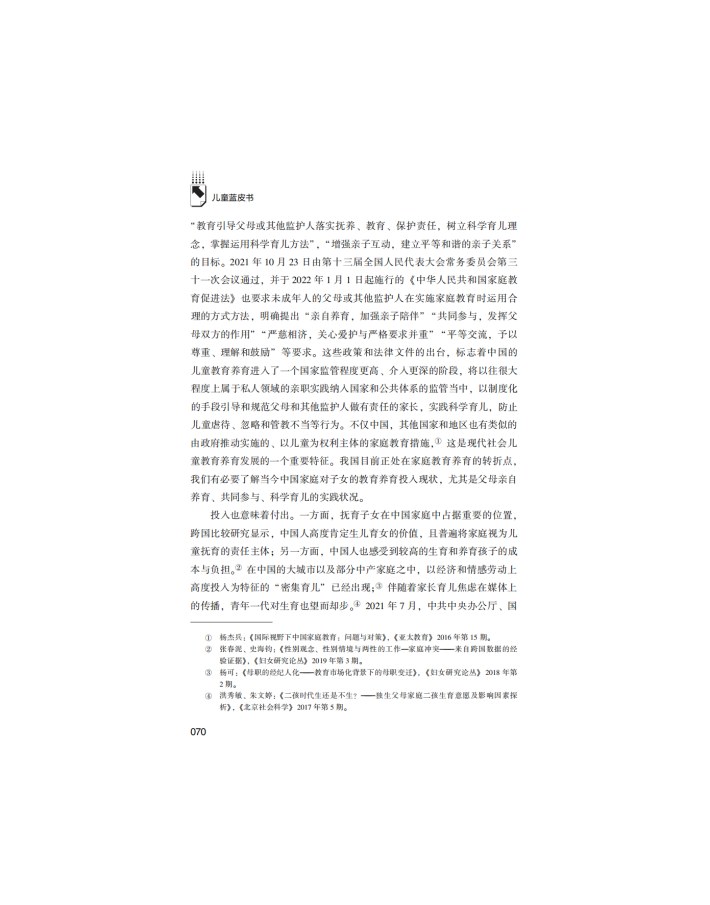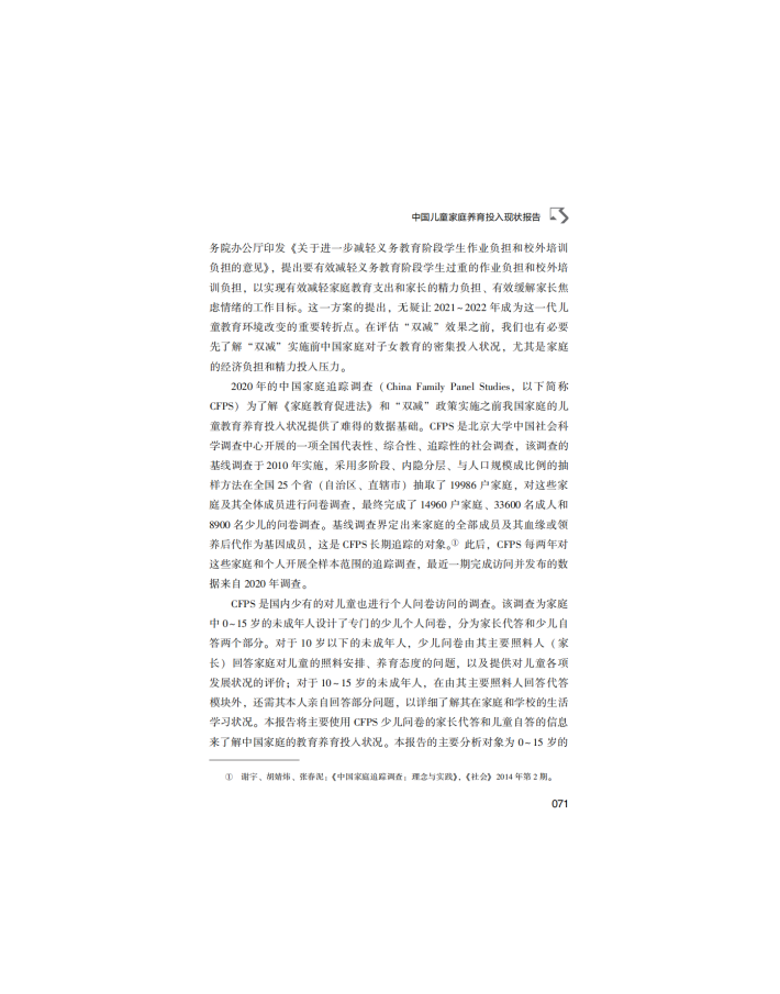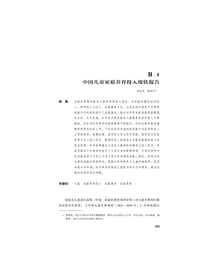 本报告聚焦家庭对儿童的养育投入现状,对家庭的教育经济投入、照料投入与分工、家庭教育方式,以及这些方面在不同背景家庭之间的差异进行了定量描述。通过对中国家庭追踪调查数据的分析,本文发现,近年来中国家庭对儿童教育的经济投入不断提高,家长对科学养育的重视程度不断提升,但这也意味着家庭教育养育成本的上升。不同社会经济地位的家庭之间在养育投入上存在差异:城镇家庭、高学历父母比农村家庭、低学历父母在养育子女上投入更多、做得更好。虽然绝大多数家庭都坚持父母亲自养育,但母亲普遍比父亲在儿童照料和辅导上投入更多。单亲家庭在子女照料和监护上不及双亲家庭做得好,父母经常争吵的家庭在亲子关系上不及父母关系和谐的家庭。据此,政府应设法降低家庭的养育成本;鼓励父亲积极参与儿童家庭养育、促进家庭关系和谐;给予单亲家庭的儿童更多的关注和帮助,建设家庭友好型的社会环境。