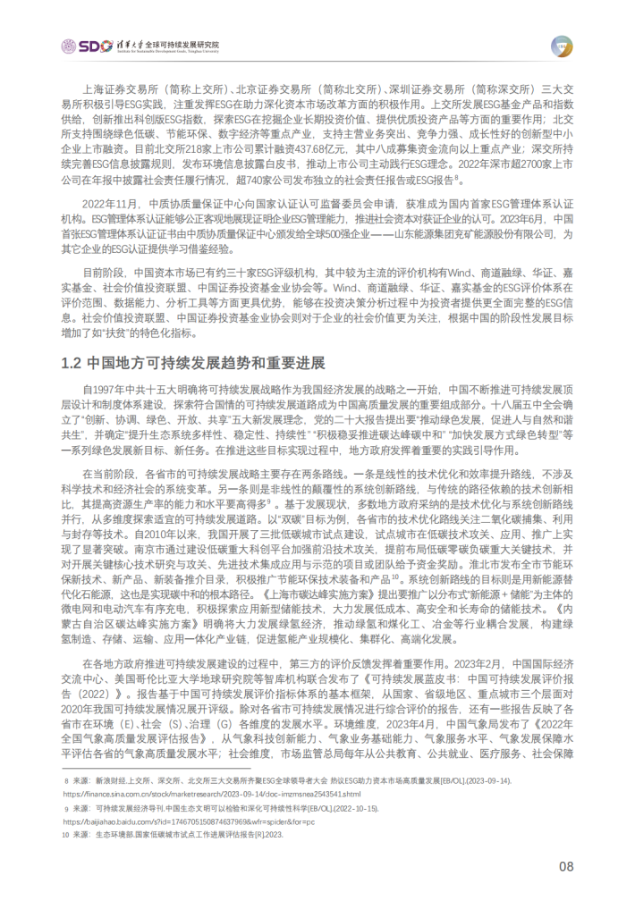 本报告首先总结了近年来中国ESG发展的整体情况与相关政策,并阐述了中国地方政府ESG评级的重要意义及应用场景。随后,本报告沿用2022年研究报告中构建的以地方政府为评级对象的ESG评级指标体系,对中国72个城市和30个省份2016-2020年的ESG总体表现情况进行了定量评级,对其环境、社会、治理维度的表现水平进行深度分析(城市ESG评级结果由低至高分为B、BB、BBB、A、AA、AAA六个等级),并对核心经济指标与ESG表现的相关关系开展了专项研究。在定量研究与案例研究的基础上,为中国地方政府推进ESG发展提出了相应政策建议。