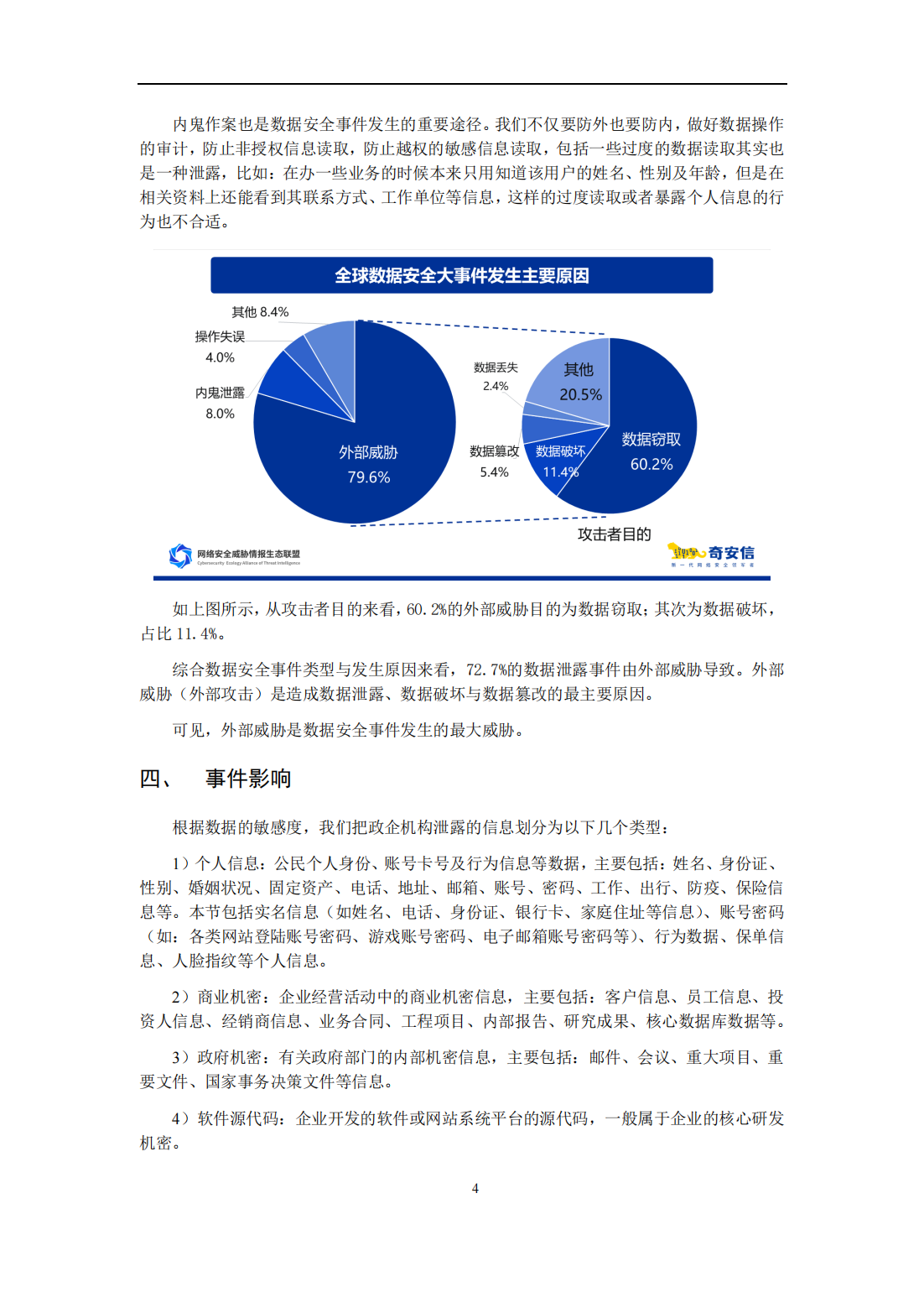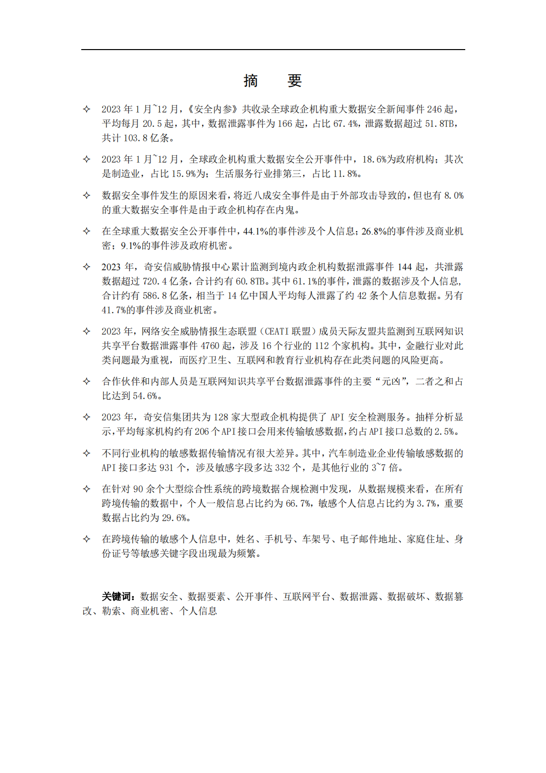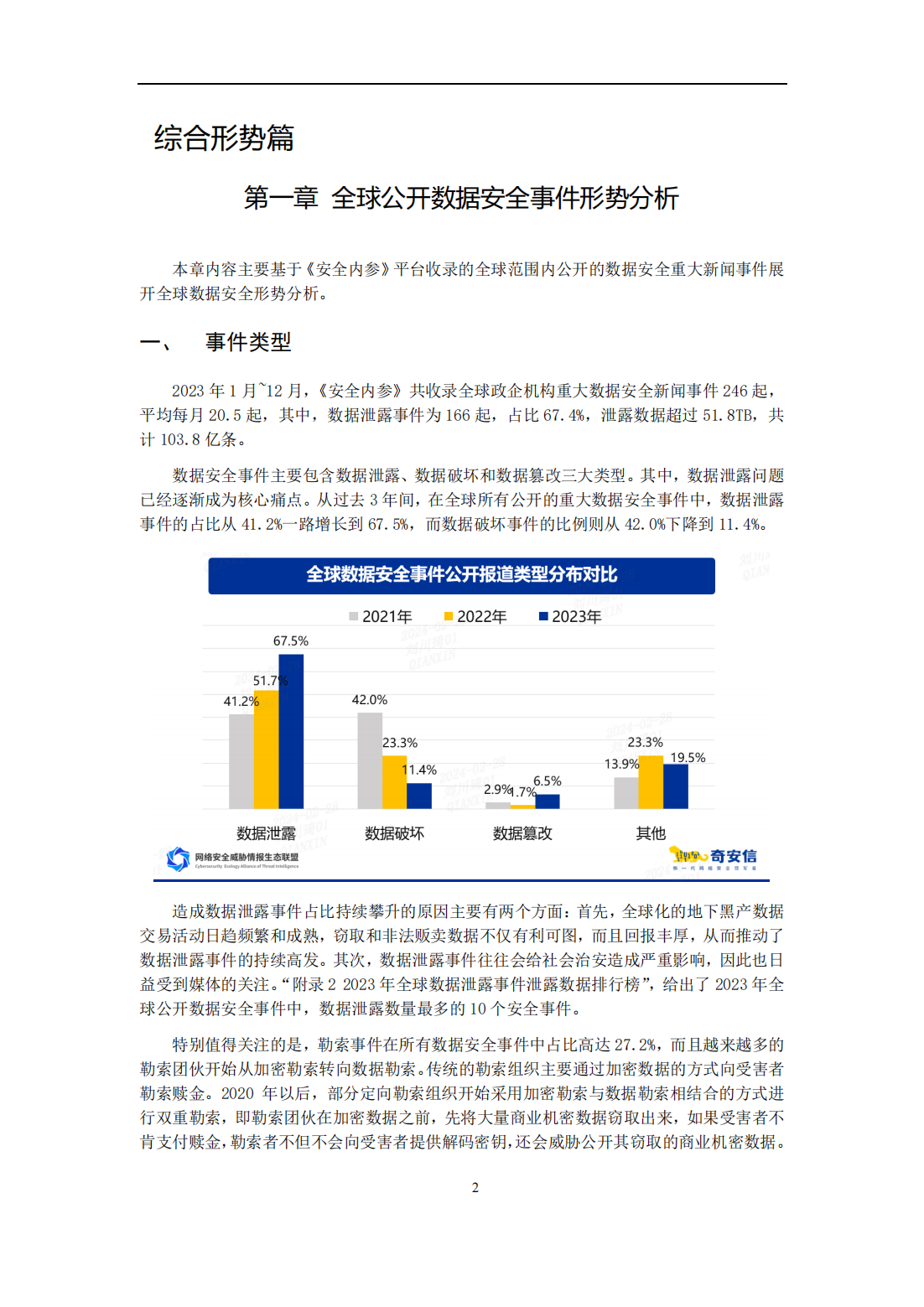 数据泄露是数据安全领域的核心问题。在2023年全球公开报道的246起数据安全事件中,数据泄露事件占比高达67.5%,泄露数据超过51.8TB,共计103.8亿条。不过,媒体公开报道的数据泄露事件可能只是数据泄露问题的冰山一角。奇安信威胁情报中心监测显示,2023年1~11月,仅在暗网及黑产平台上交易的境内机构泄露数据就多达60.8TB,共计720.4亿条,两项指标双双超过全球媒体公开报道事件的统计数据。