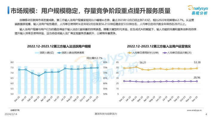 伴随移动互联网市场发展成熟,第三方输入法用户规模呈现同比小幅增长态势,截止2023年12月已经达到7.83亿,相比2022年同期增长2.7%。从运营端数据表现看,输入法用户粘性稳定,人均单日使用时长在年初2月份涨至56.21分钟后稳定在53分钟左右,人均单日启动次数全年保持在28次以上。