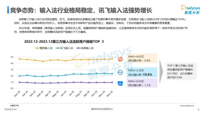 目前第三方输入法行业仍然由搜狗、讯飞、百度组成的头部集团占据了较高的集中度并稳定发展,尤其是讯飞输入法相比22年12月同比增幅达19.6%。同时,头部企业伴随Al新技术的引入,将竞争集中在技术创新和产品功能改进上,智能化、定制化、个性化的服务成为市场重要的竞争要素。
