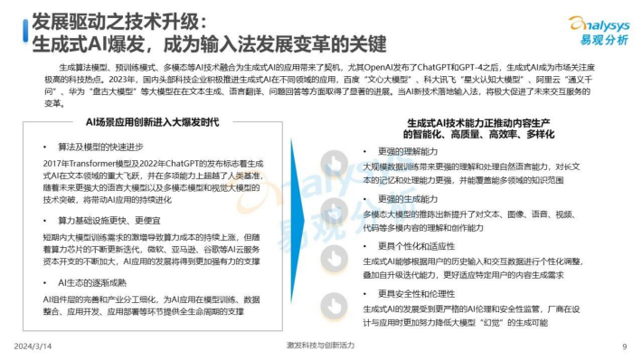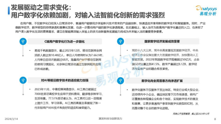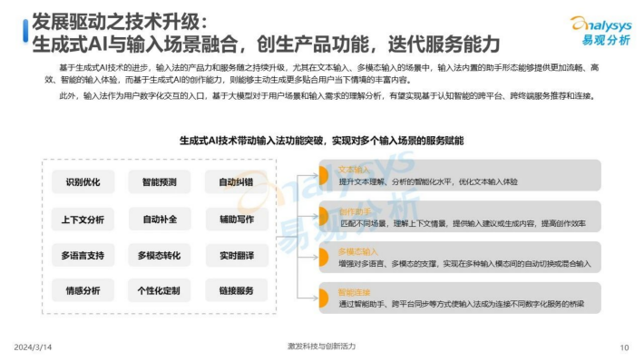 输入法用户规模与用户行为的稳定得益于输入法在C端场景的持续渗透。随着大模型时代来临,在生成式AI的赋能下,输入功能的完善和服务创新将持续提升输入效率及使用体验,这也将促成输入法厂商实现服务质量跃升,以破局存量竞争。