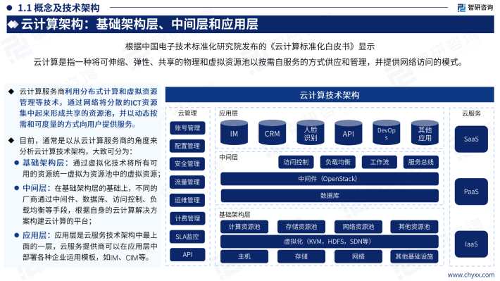 应用层:应用层是云服务技术架构中最上面的一层,云服务提供商可以在应用层中部署各种企业运用模板,如IM、CIM等。