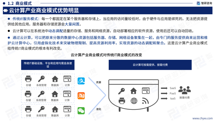 通过云计算,可以把原来分散的数据中心资源包括服务器、存储、网络设备聚集在一起,由专门的服务提供商来运营和维护云计算中心,引用虚拟化技术来突破物理限制、提高资源利用率,实现资源的动态调配和聚合。这是云计算产业商业模式给传统IT商业模式的根本有利改变。