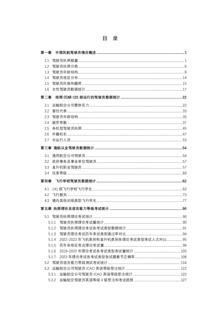 截至2023年12月31日,中国民用航空局颁发的有效民用航空器驾驶员执照总数为86091本,其中运动驾驶员执照(SPL)2514本,私用驾驶员执照(PPL)5317本,商用驾驶员执照(CPL)48580本,多人制机组驾驶员执照(MPL)158本,航线运输驾驶员执照(ATPL)29522本。