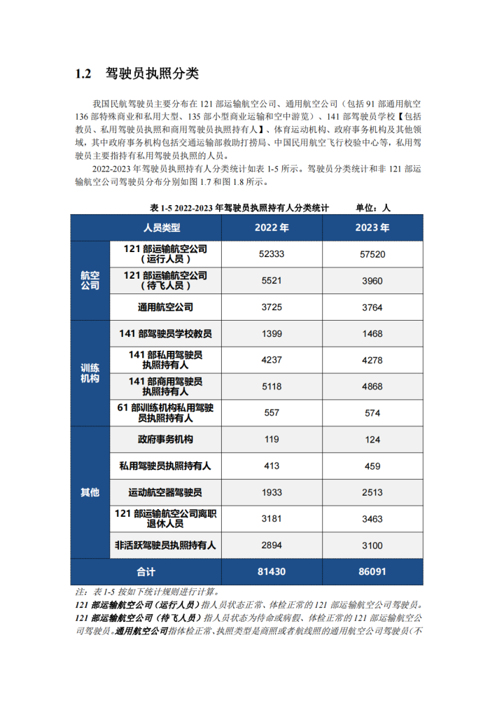 我国民航驾驶员主要分布在121部运输航空公司、通用航空公司(包括91部通用航空136部特殊商业和私用大型、135部小型商业运输和空中游览)、141部驾驶员学校【包括教员、私用驾驶员执照和商用驾驶员执照持有人】、体育运动机构、政府事务机构及其他领域,其中政府事务机构包括交通运输部救助打捞局、中国民用航空飞行校验中心等,私用驾驶员主要指持有私用驾驶员执照的人员。