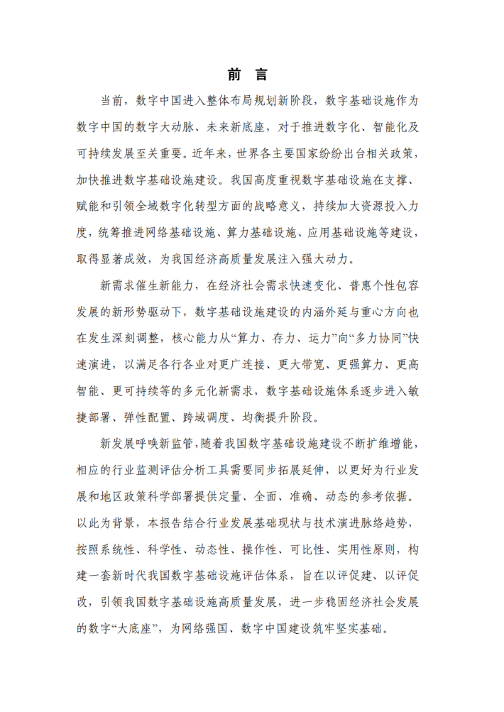 新发展呼唤新监管,随着我国数字基础设施建设不断扩维增能,相应的行业监测评估分析工具需要同步拓展延伸,以更好为行业发展和地区政策科学部署提供定量、全面、准确、动态的参考依据。以此为背景,本报告结合行业发展基础现状与技术演进脉络趋势,按照系统性、科学性、动态性、操作性、可比性、实用性原则,构建一套新时代我国数字基础设施评估体系,旨在以评促建、以评促改,引领我国数字基础设施高质量发展,进一步稳固经济社会发展的数字“大底座”,为网络强国、数字中国建设筑牢坚实基础。