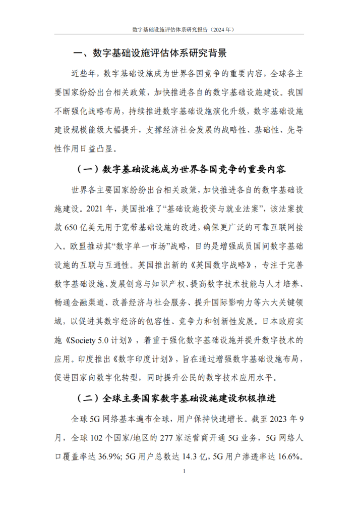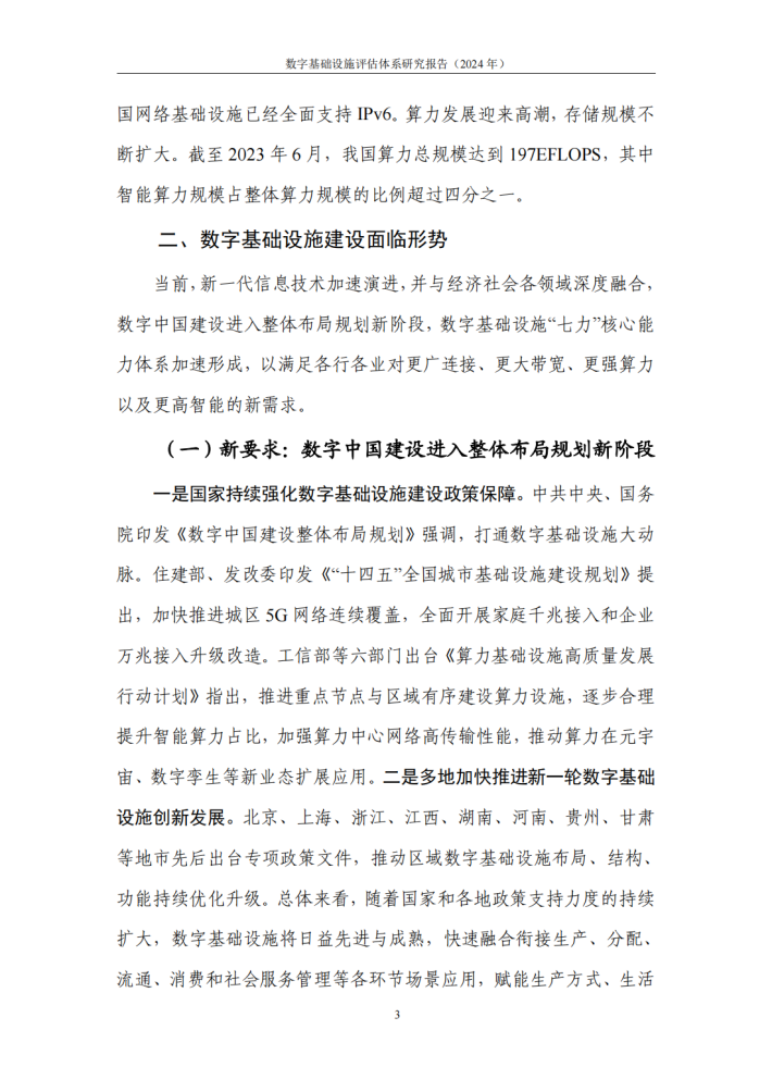 当前,数字中国进入整体布局规划新阶段,数字基础设施作为数字中国的数字大动脉、未来新底座,对于推进数字化、智能化及可持续发展至关重要。近年来,世界各主要国家纷纷出台相关政策,加快推进数字基础设施建设。我国高度重视数字基础设施在支撑、赋能和引领全域数字化转型方面的战略意义,持续加大资源投入力度,统筹推进网络基础设施、算力基础设施、应用基础设施等建设,取得显著成效,为我国经济高质量发展注入强大动力。