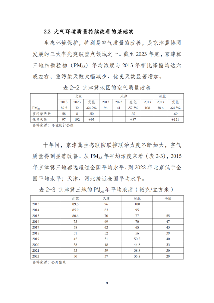生态环境是京津冀协同发展率先突破的重点领域。十年间,生态环境质量取得了显著改善,空气质量逐步提升,雾霾天气显著减少。2021年首次达标以来,北京PM₂s年均浓度连续三年稳定达到国家二级标准(35微克/立方米),2023年京津冀地区PM₂s年均浓度较2013年下降约60%,重污染天数均大幅削减、优良天数大幅增加。