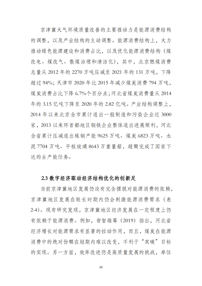 在京津冀及周边地区大气污染防治协作机制、大力推动绿色能源和优化能源消费结构的同时,数字经济牵引经济结构优化,赋能产业数字化,也是助力区域生态环境质量改善、推动实现“双碳”目标的重要因素,正是因为数字经济蓬勃发展,推动了经济社会发展全面绿色转型,促进了经济高质量发展和生态环境高水平保护的协同共进。